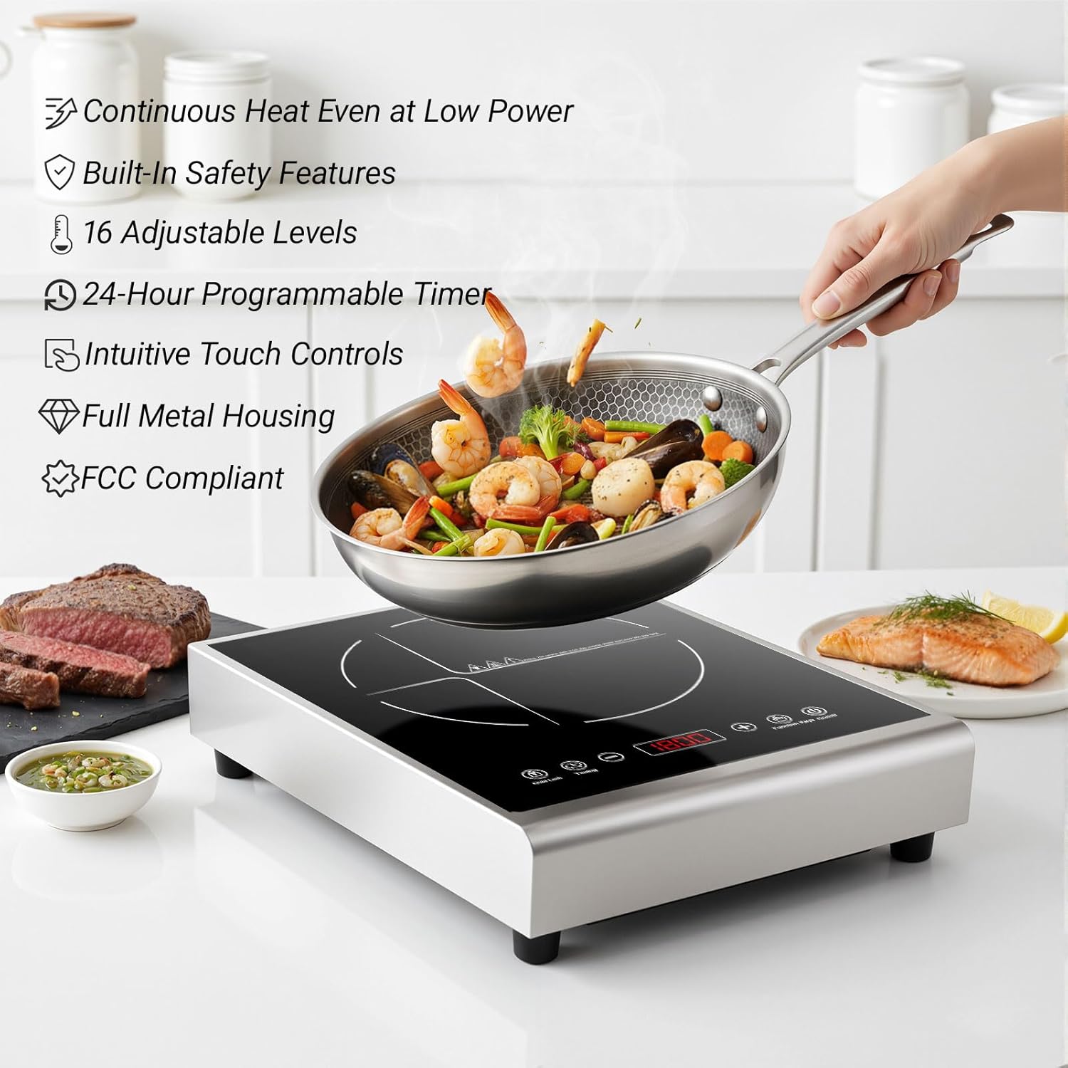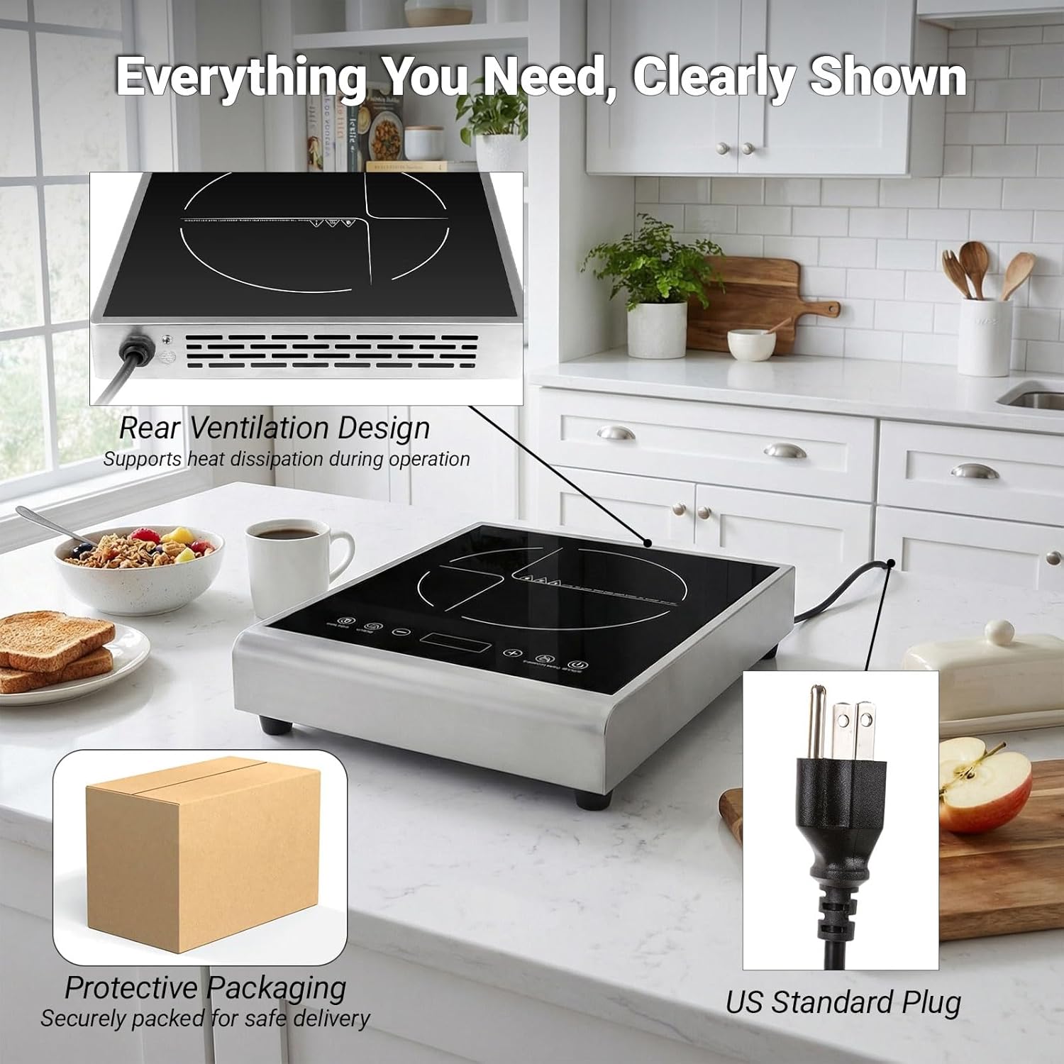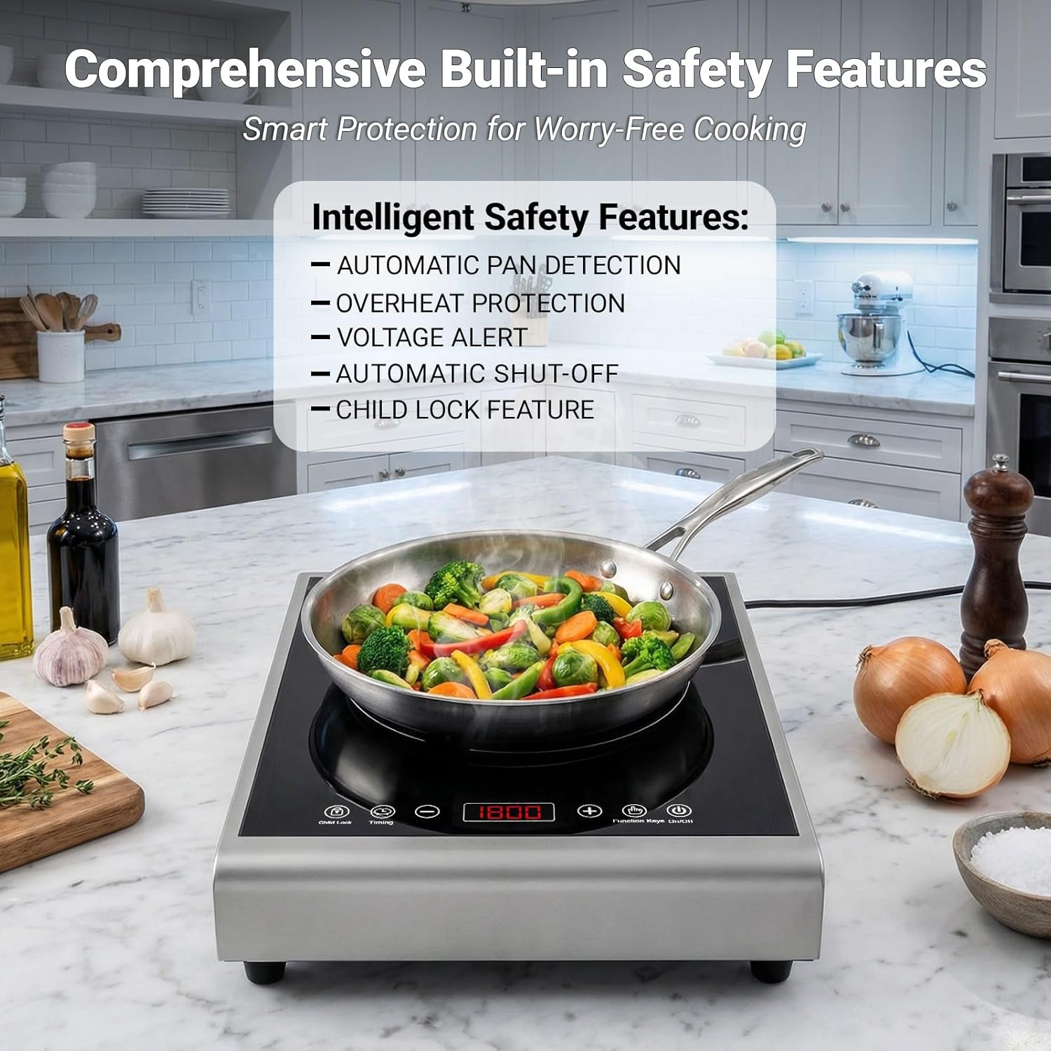 [Stable Continuous Heating] This 1800W portable induction cooktop delivers steady, continuous heat even at low power, allowing food to simmer or melt smoothly without the frequent heat cycling commonly found in pulse-heating induction burners. This stable heating behavior helps reduce the risk of scorching during low-heat cooking, making it suitable for both beginners and experienced cooks who need consistent heat for simmering, melting, and other gentle cooking tasks.