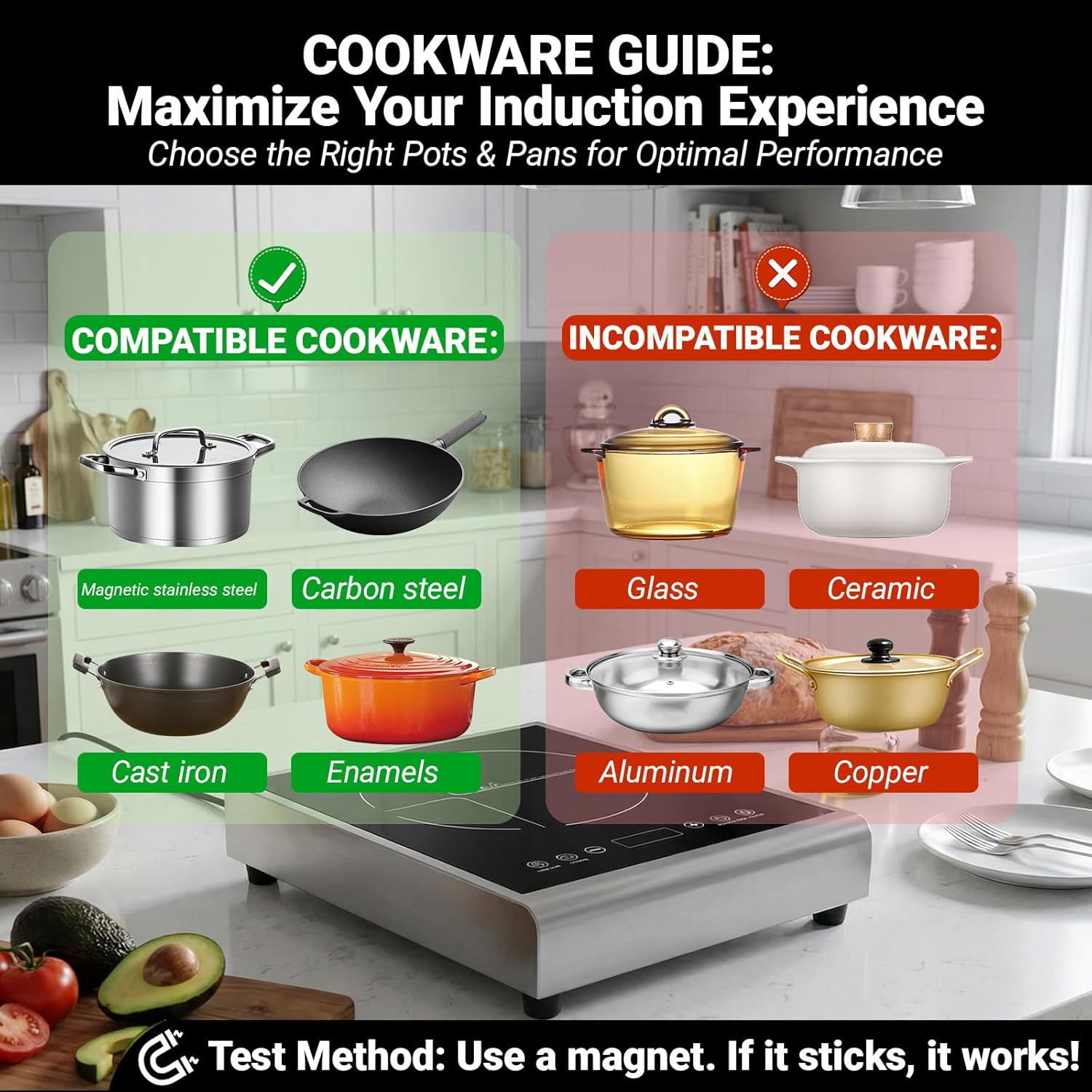 [Induction-Compatible Cookware] This electric cooktop is designed for use with induction-compatible, flat-bottom cookware, including cast iron, enameled iron, carbon steel, and magnetic stainless steel pots and pans. If you are unsure whether your cookware is compatible, a small magnet is included in the package—simply place the magnet on the bottom of the cookware, and if it sticks, the cookware is suitable for use with this electric burner.