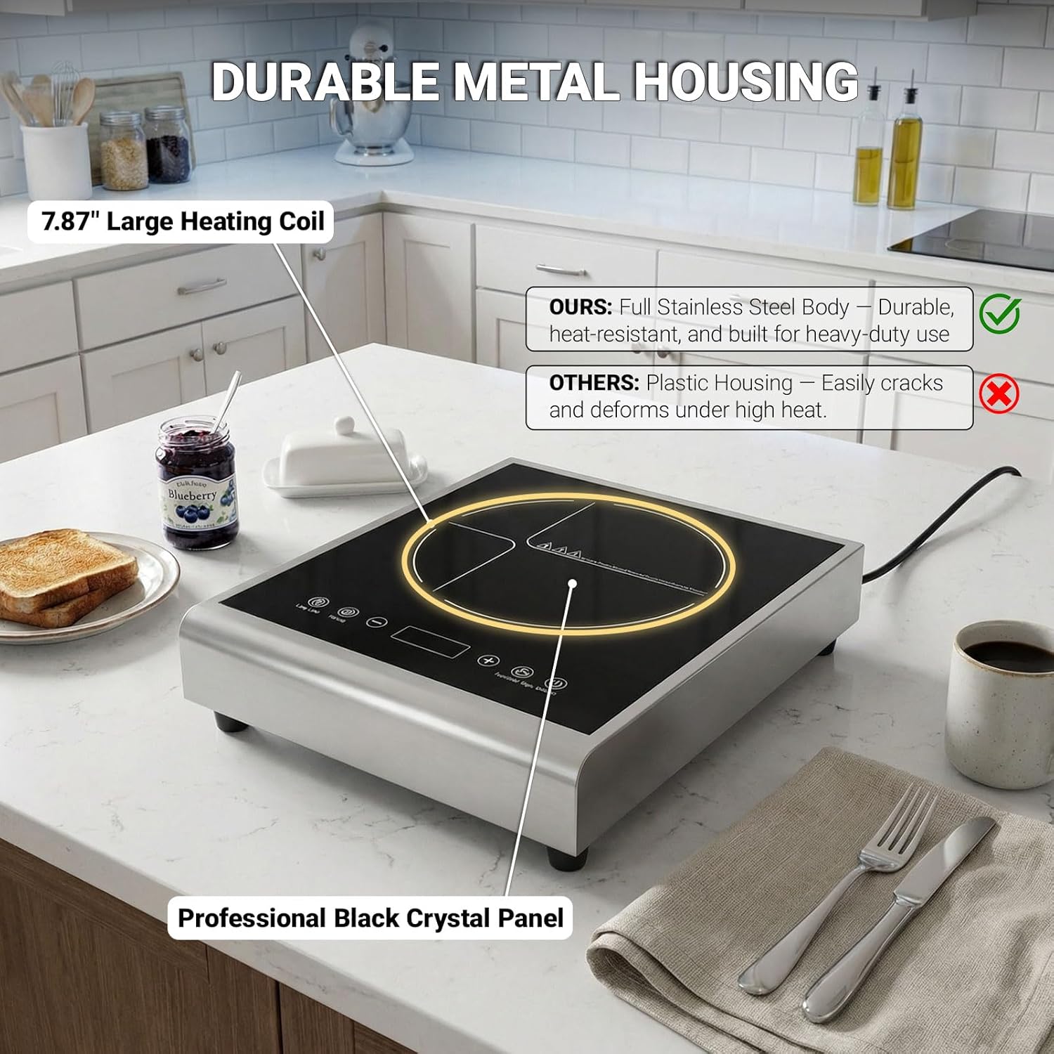 [Full Stainless Steel Body] Featuring a black crystal glass cooking surface and a full stainless steel body, this countertop burner is built for long-term everyday use. The solid stainless steel housing enhances durability and resistance to heat and wear, avoiding the lightweight feel of partial-metal or plastic-bodied designs and providing greater stability and confidence during daily home cooking.