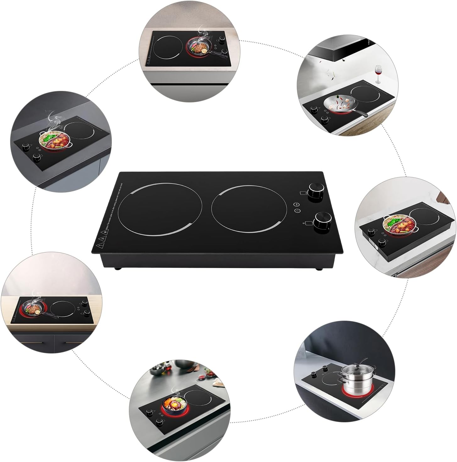 【Safety Protection】Multiple heat dissipation holes, a bottom cooling fan, and a panel high-temperature display function can effectively ensure safety. In addition, compared to traditional g-as stoves, it avoids the risk of open fla-mes. When the cooking utensils are not recognized within 1 minute, this electric countertop double burner will automatically turn off, so you can use it with confidence.