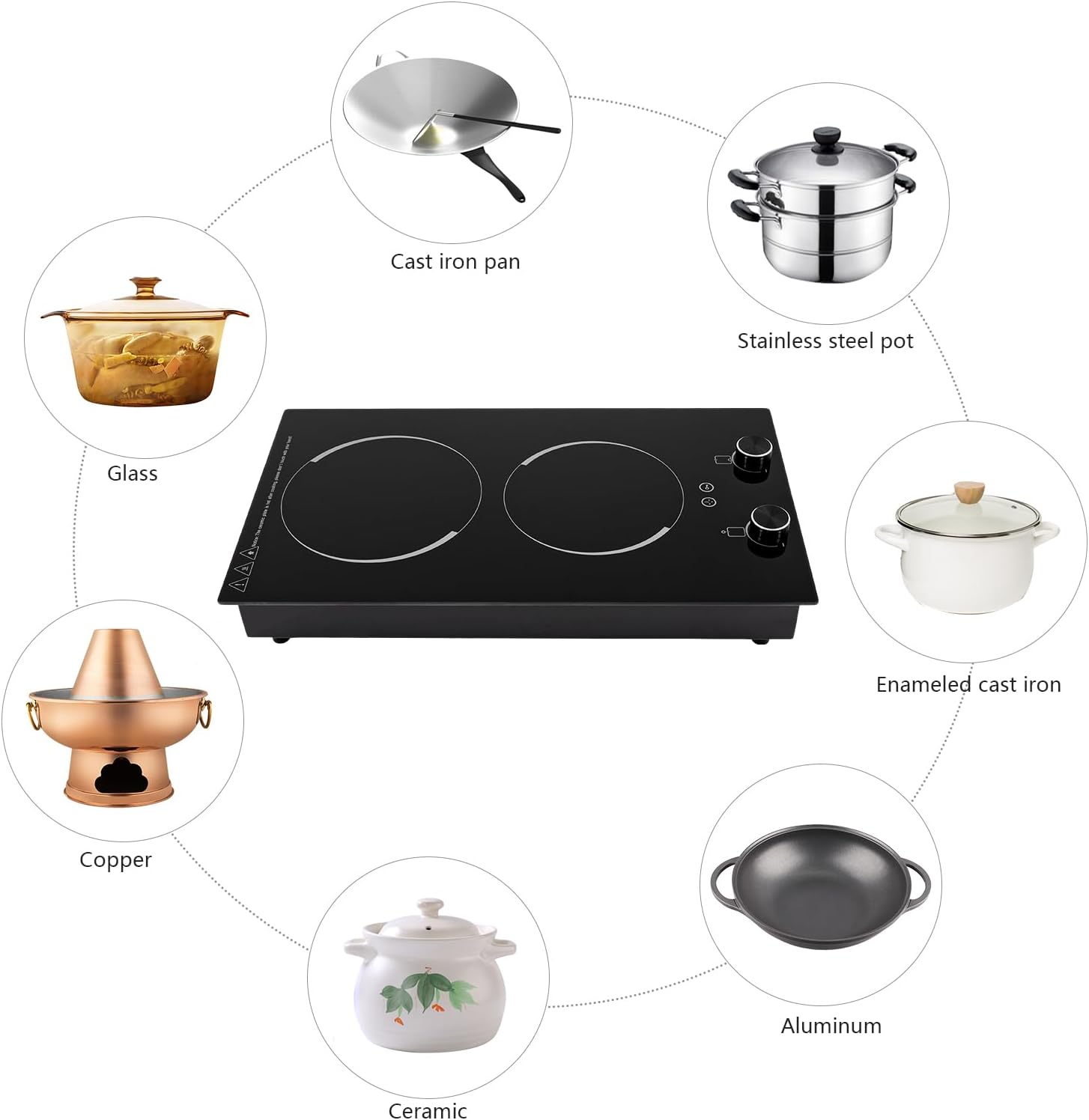 It is suitable for kitchens, cabins, offices, studios, hotels, restaurants, studio apartments, and other small spaces without full stovetops. It is suitable for iron pots, stainless steel pots, casserole pots, copper pots, barbecue pots, ceramics pots, aluminum pots, and all frying pans with a diameter of 6.69-7.87in.