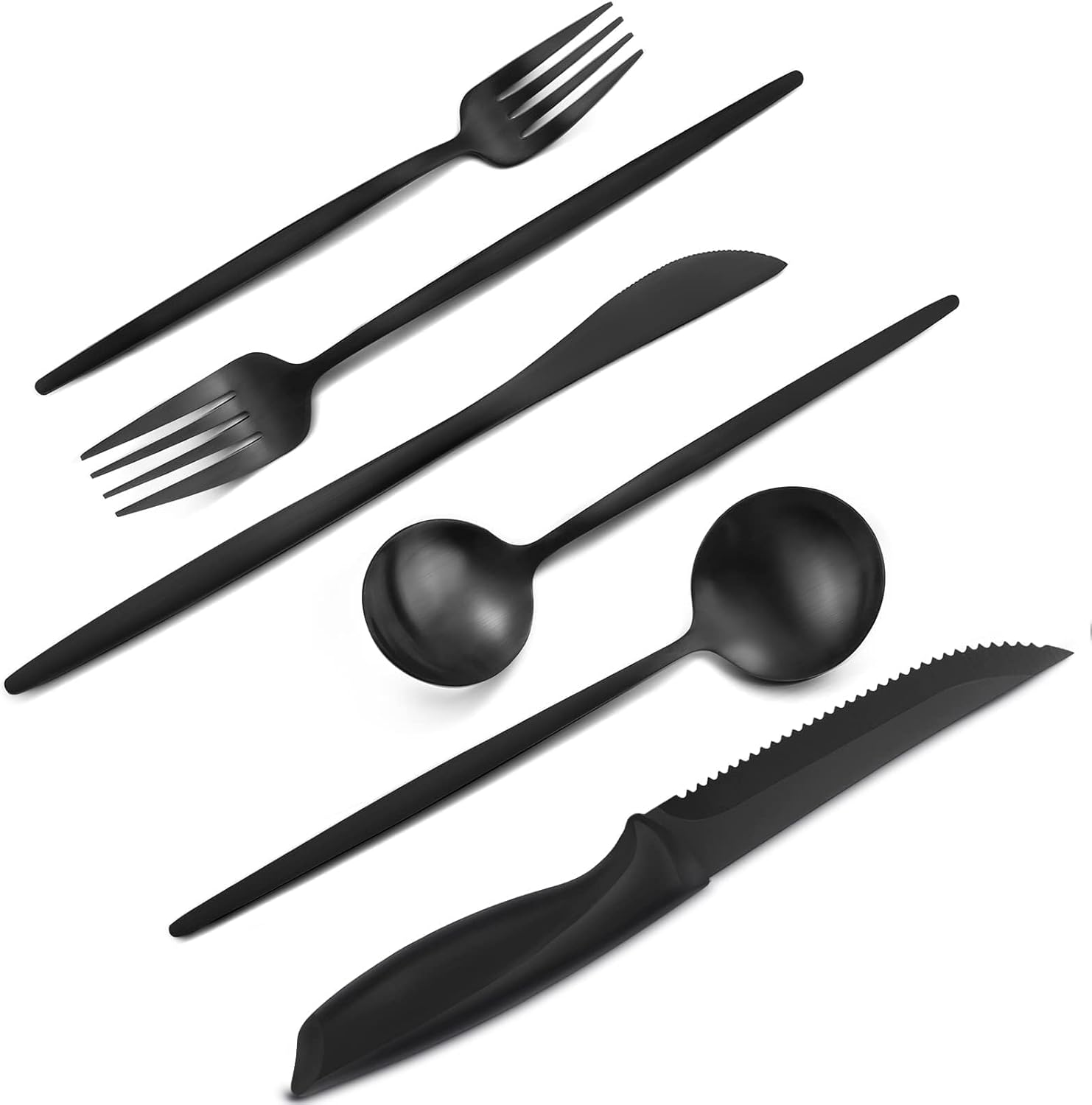 Add steak knife – VANVRO 24 pieces matte black silverware set with steak knife,stainless steel black utensil set constantly enrich the product line, This time,black cutlery set with steak knife was added, which has more comprehensive functions. What a happy thing it is for the whole family to enjoy steak dinner together.
