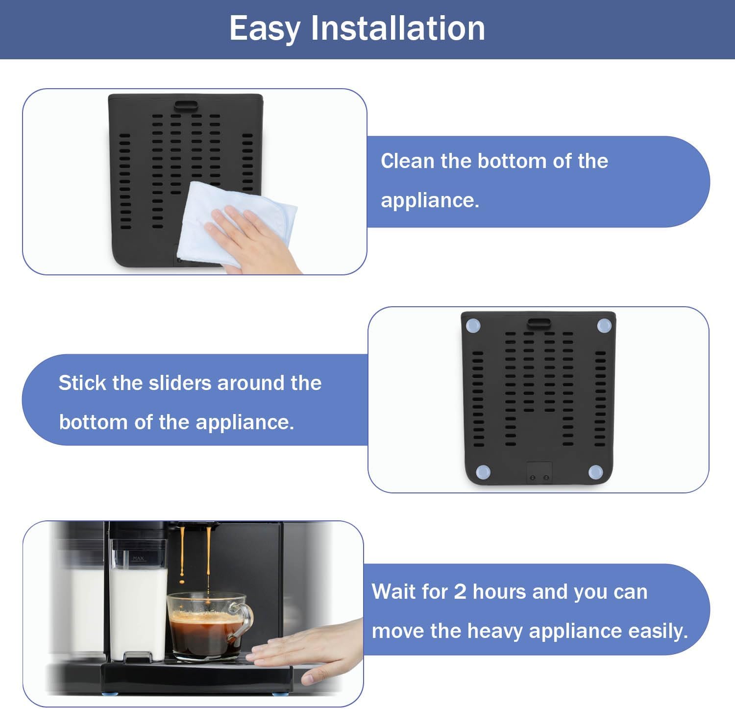 【Easy to Use】With the strong stickiness, the appliance slider is very easy to install. Clean the bottom of the appliance, peel off the sticker and attach the slider firmly on the bottom. Wait for 12 hours and start to use.