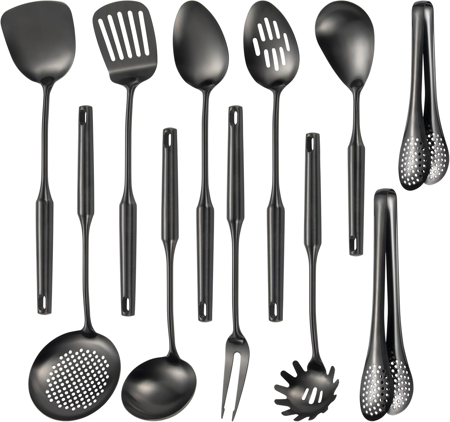 12Pcs Kitchen Utensils Set: Lazycorner Utensils Serving Set consists of 1 Soild Turner, 1 Soup Ladle, 1 Slotted Spoon, 1 Slotted Spatula Tunner, 1 Pasta Server, 1 Large Spoon, 1 spaghetti spoon, 1 Serving Spoon, 1 Slotted Spoon, 1 Meat Fork, 2 Serving Tongs. Enhance your cooking experience with 11 kitchen accessories that perfectly for your cooking needs