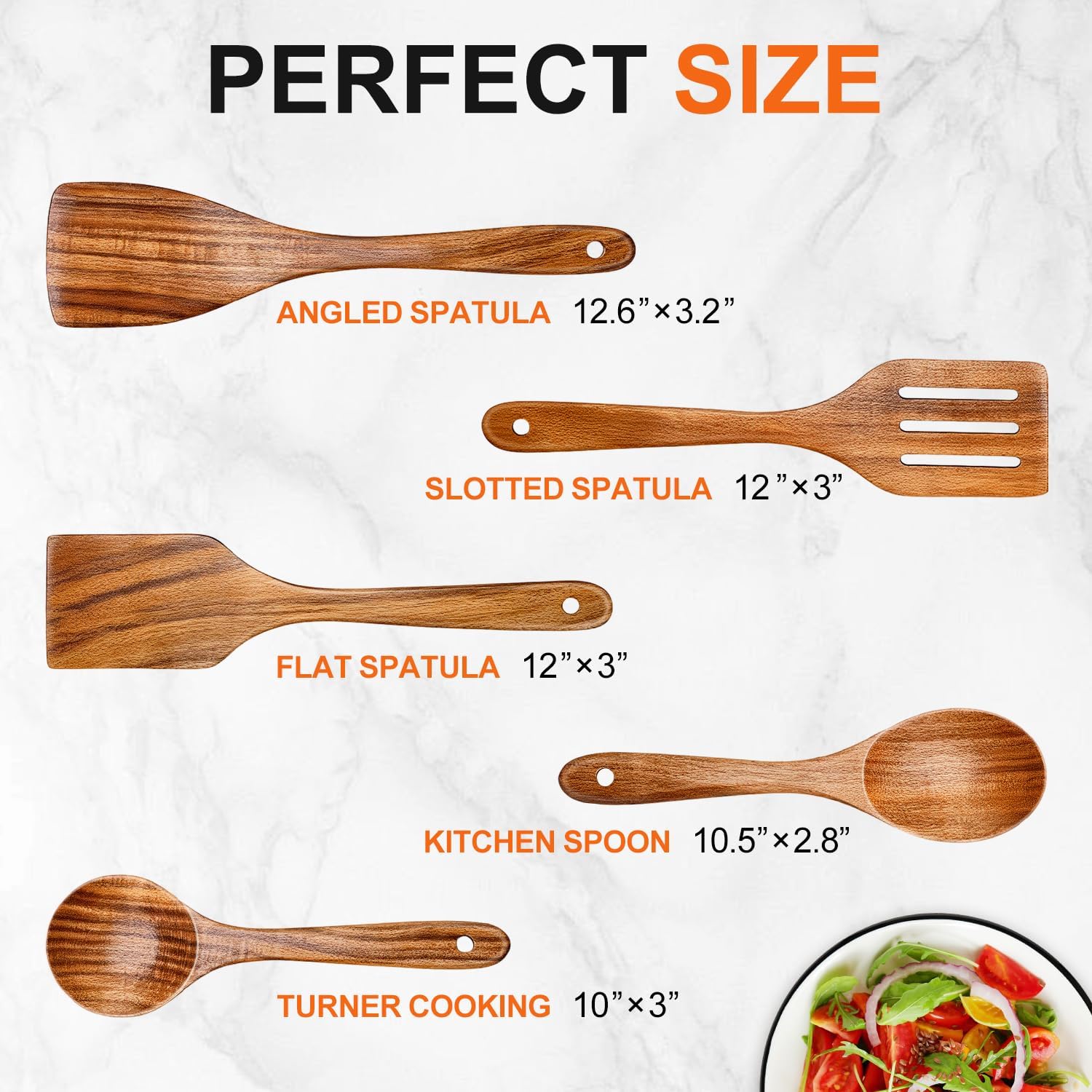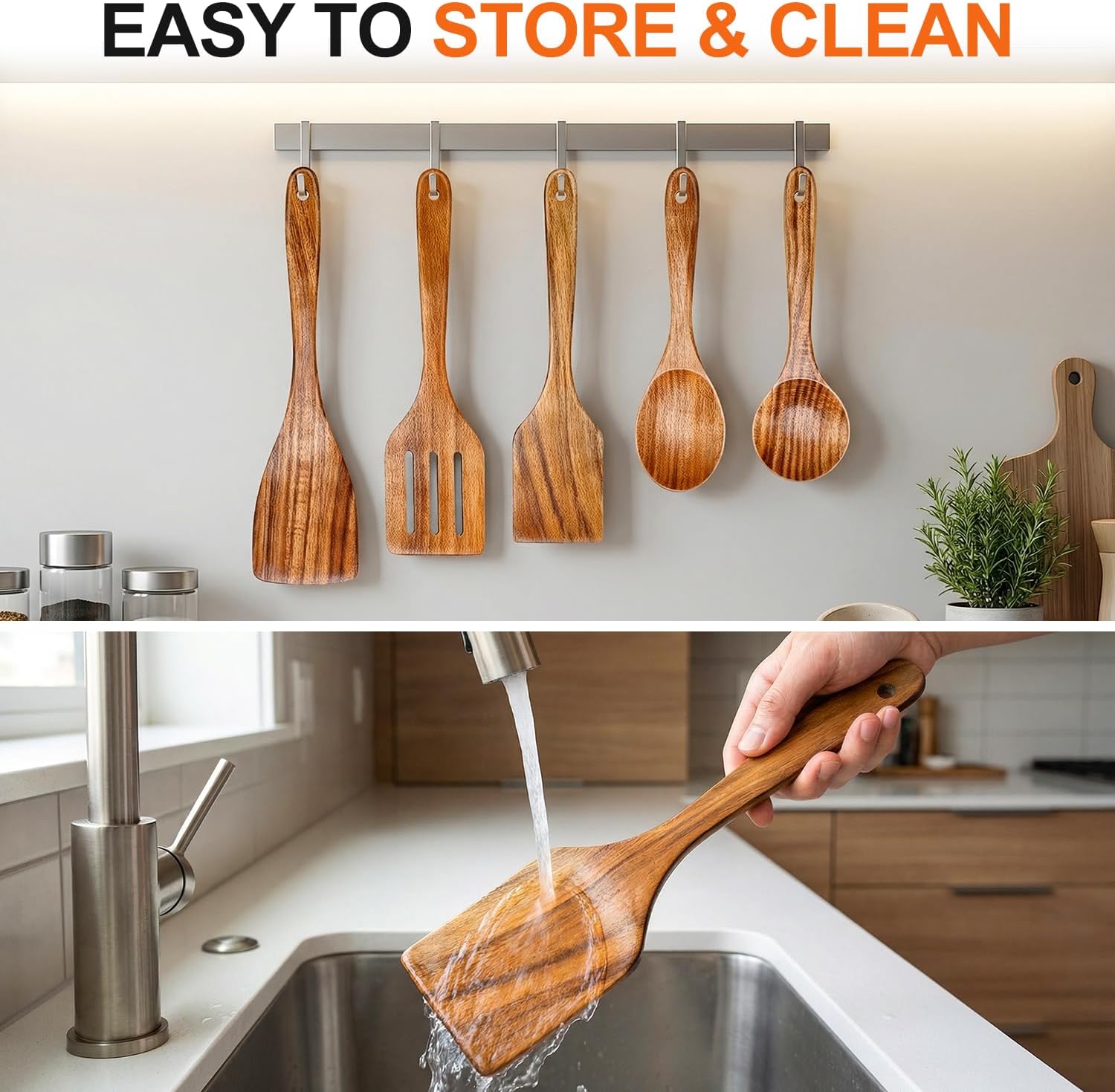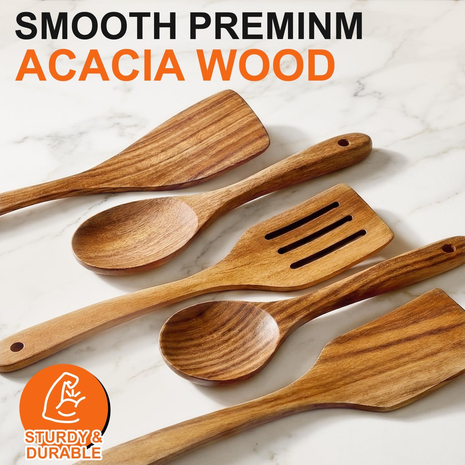 Non Stick Utensils Durable acacia wooden utensils won’t crack like bamboo spoons.The smooth surface also provide comfortable grip.