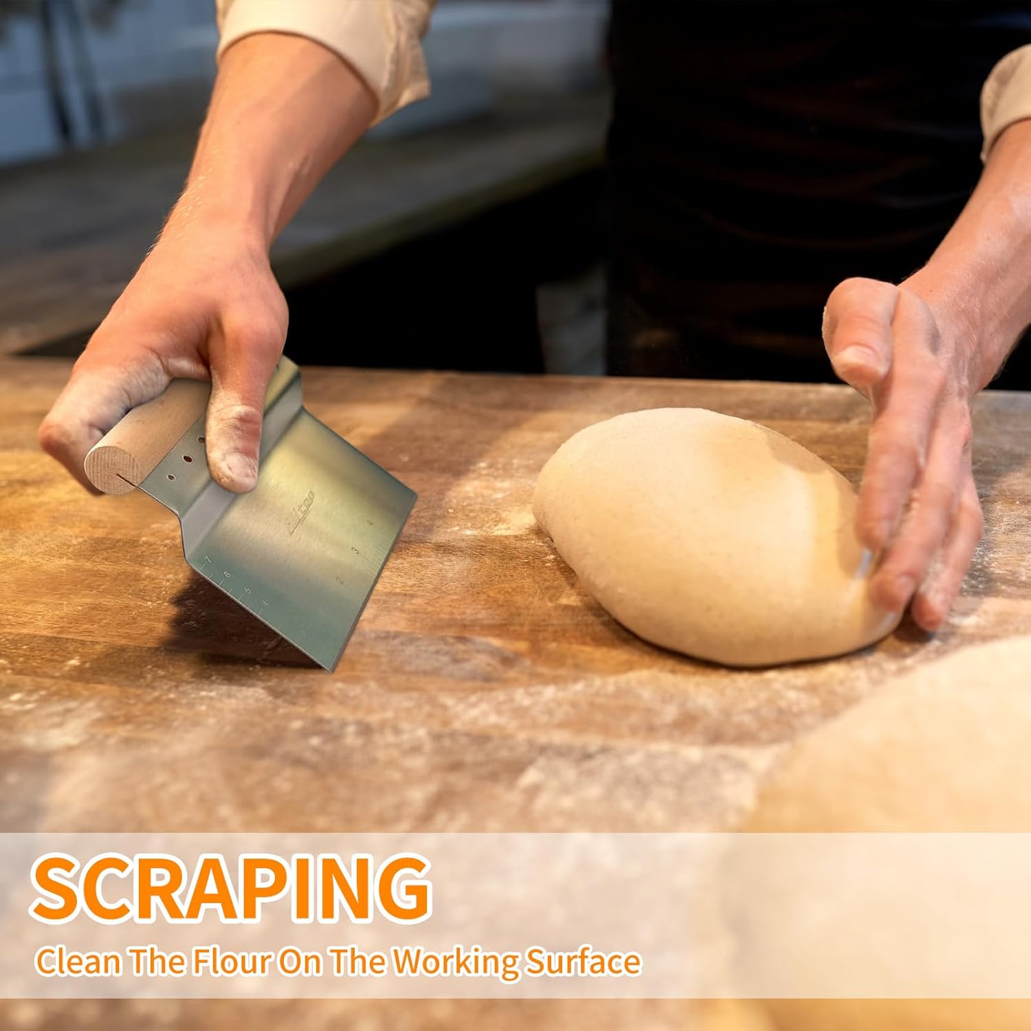 Double Side Marks: Featuring advanced laser engraving technology, our pastry scraper is designed with clear measurement markings that won’t wear away over time. The measurement scale ensures equal dough portions without the need for extra tools. Additionally, a conversion chart is included for your convenience.