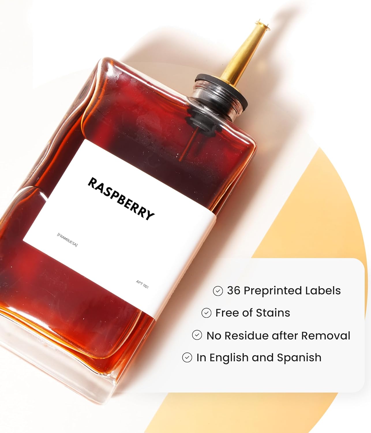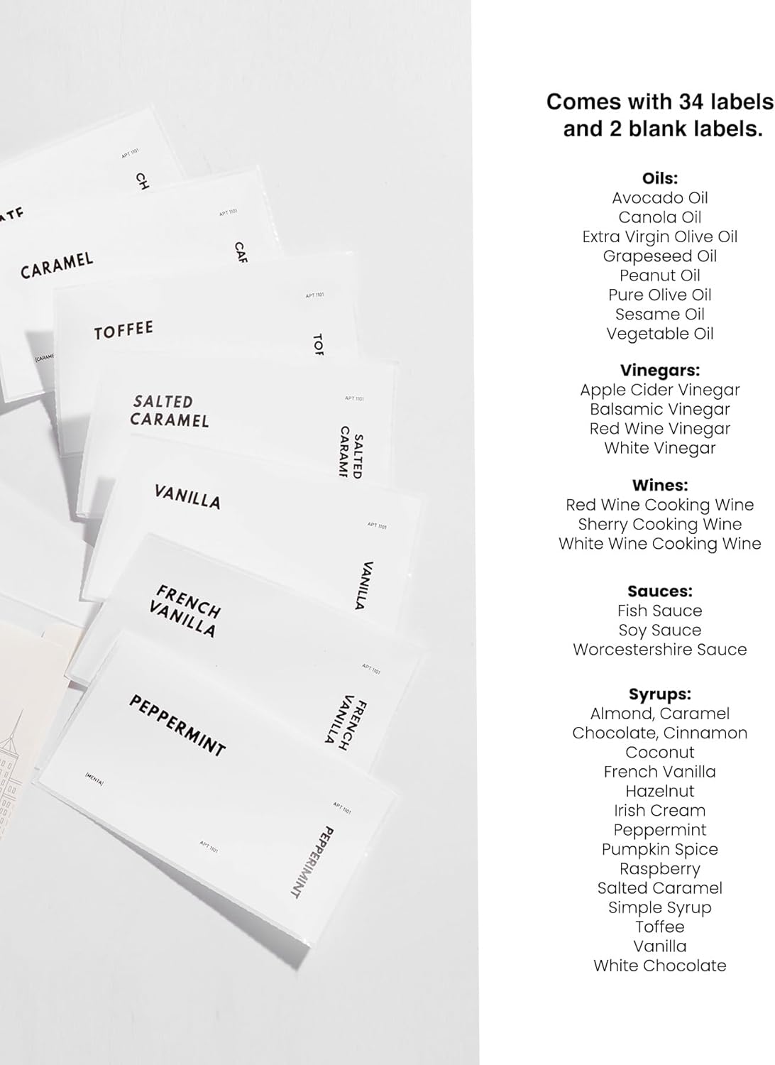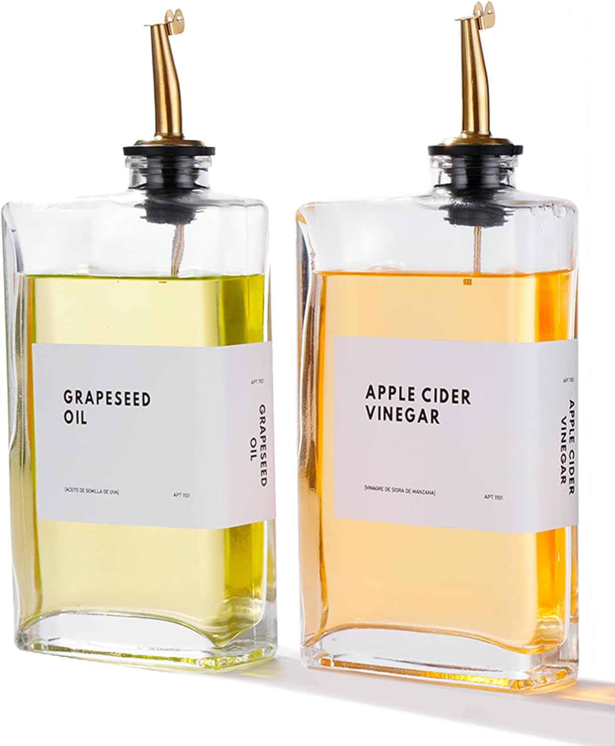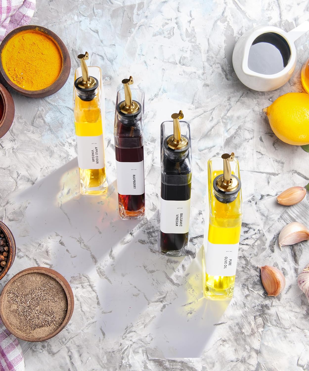 Versatile Usage. Use it as a drizzle olive oil container, vinegar dispenser, soy sauce bottle, coffee syrup bottle or vinegar and oil dispenser set — this olive oil bottle dispenser suits various needs. It also comes with a 36 designed water-proof, weather-proof label set for your custom use.