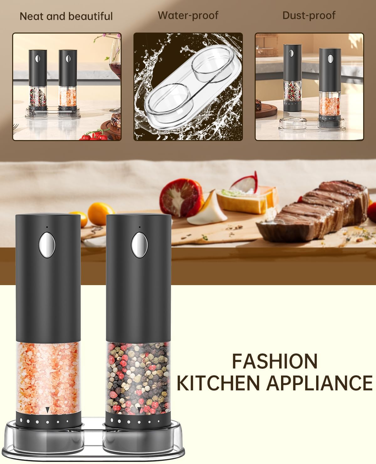 ✔️One-Handed Operation – With a simple press of the button, the rechargeable electric pepper grinder set offers effortless and user-friendly operation, allowing you to season your dishes with just one hand. The salt and pepper shakers set electric includes a clear storage base that prevents tipping, keeps your grinders organized and helps maintain a tidy kitchen countertop