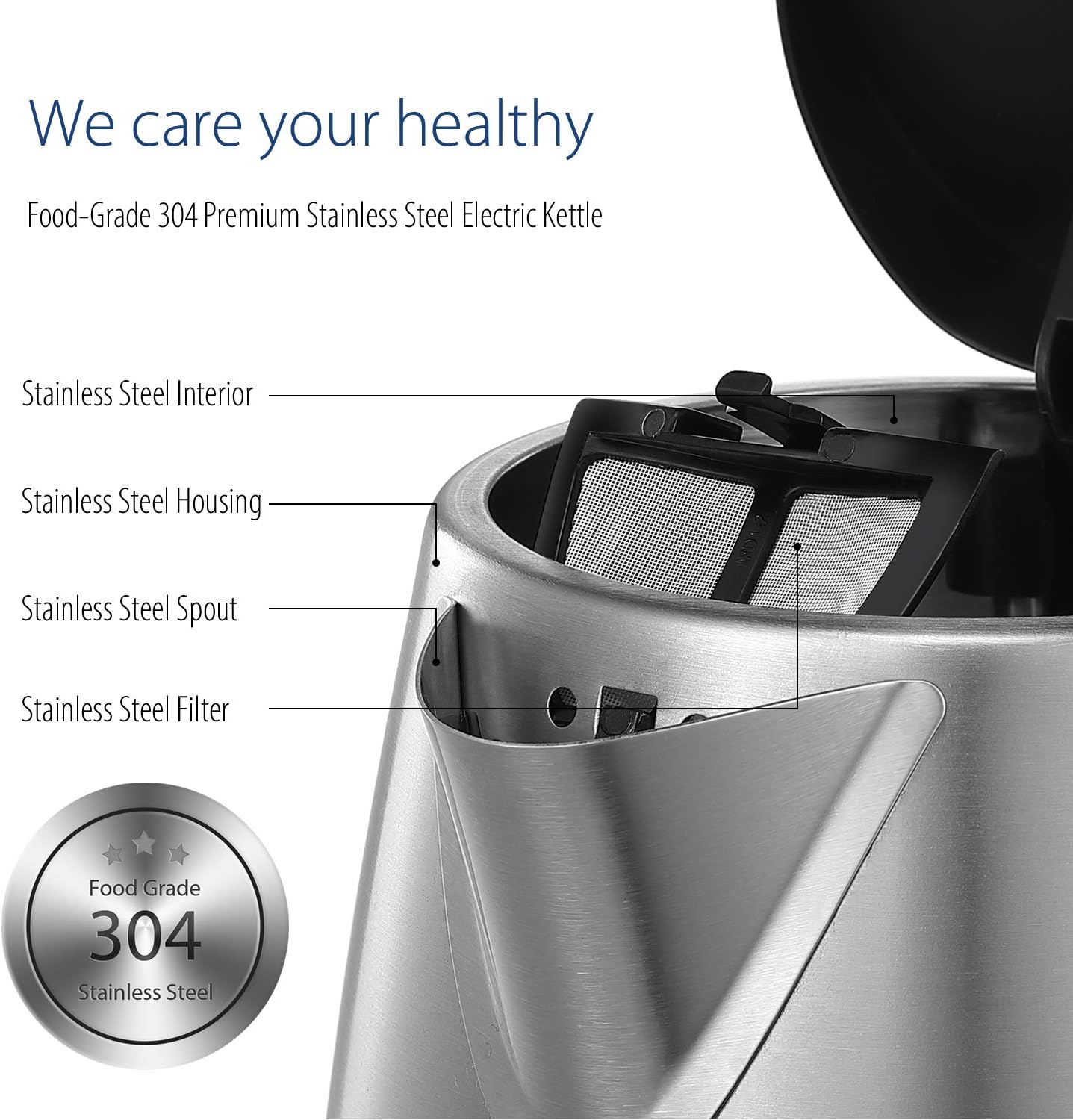 Premium Stainless Steel – 304 food-grade stainless steel inner pot and brushed stainless steel housing. BPA-free food grade materials, removable nylon filter for easy cleaning, easy-to-view water window