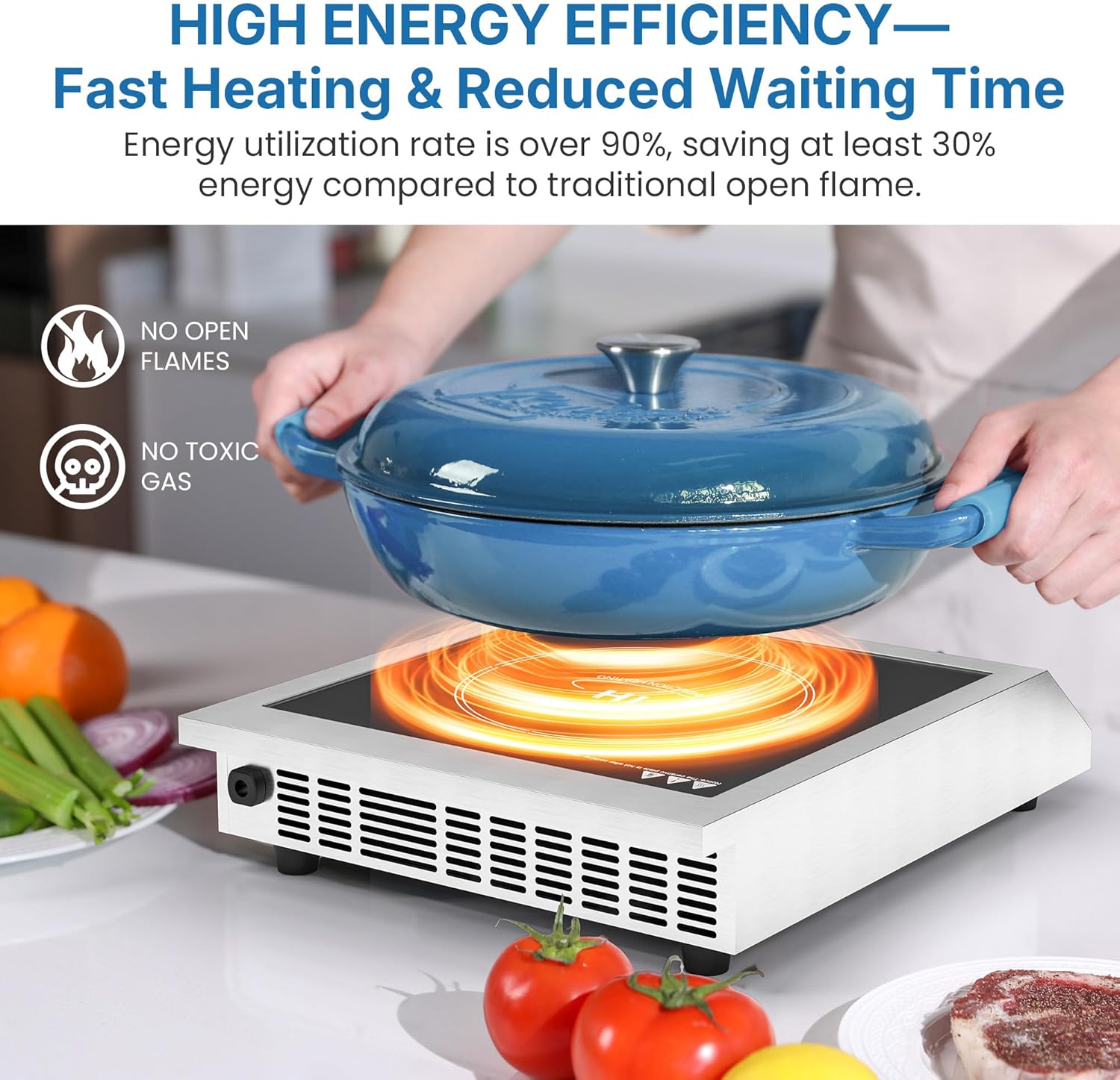 Powerful and Fast Heating: Featuring 10 power settings from 100W to 1800W, this induction hot plate uses cutting-edge induction technology to heat only the pot’s base, ensuring over 90% energy efficiency. It saves at least 30% more energy than traditional stoves and heats up quickly, minimizing wait time.