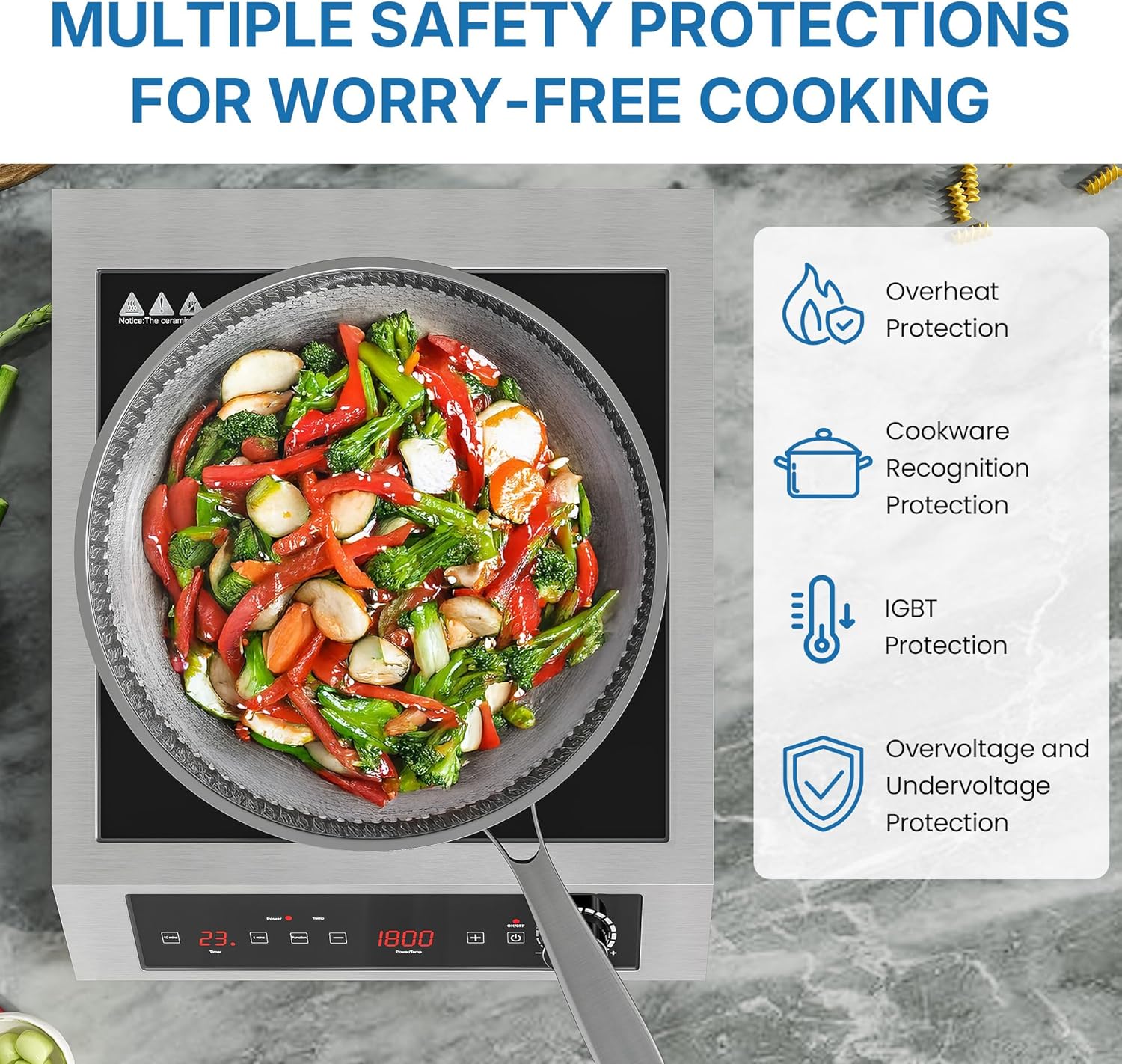 Enhanced Safety Protection: This induction cooker includes smart safety functions such as automatic power-off when no pot is detected, overheat protection, IGBT temperature control, and voltage protection. It provides a safer and more reliable cooking experience.