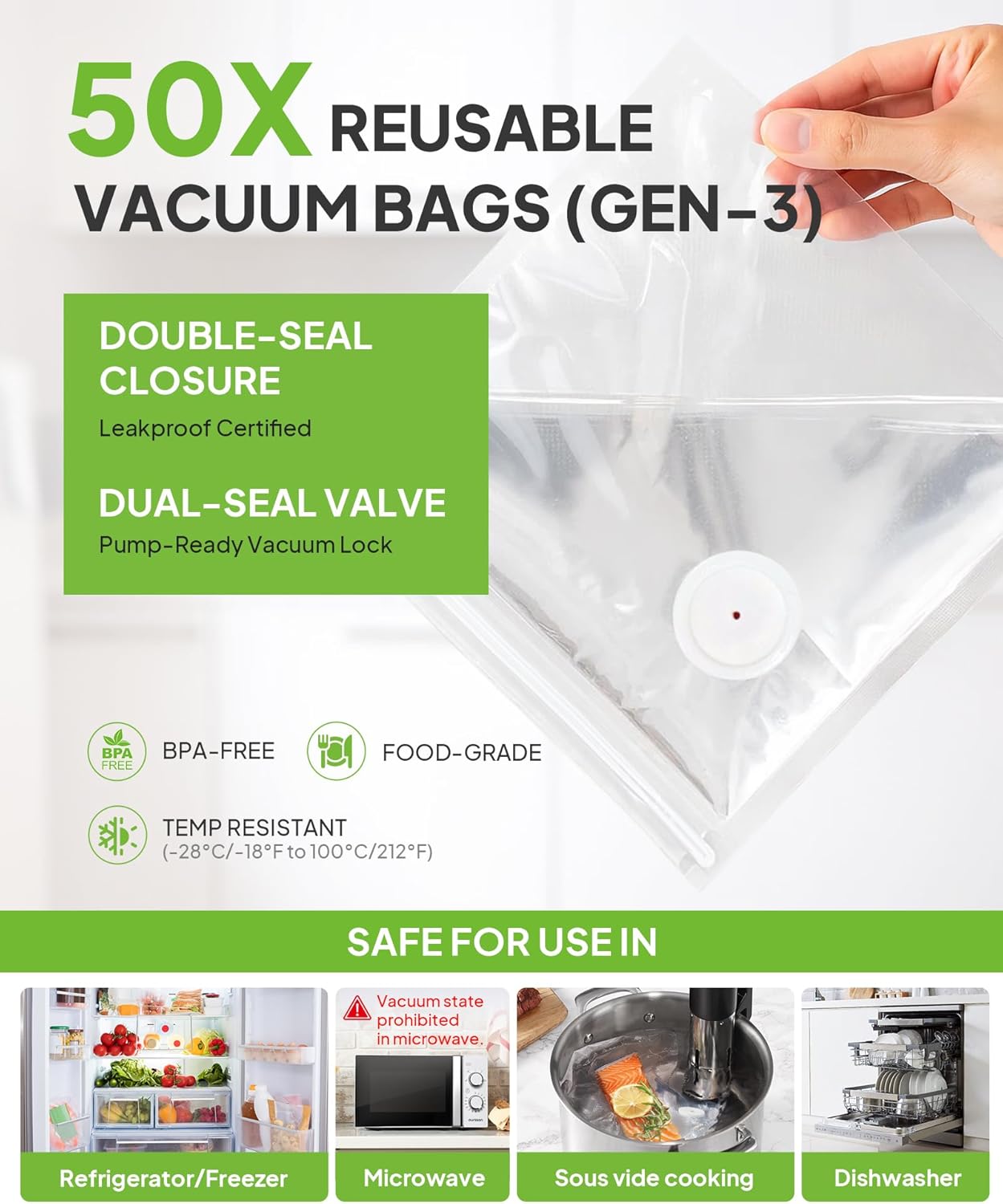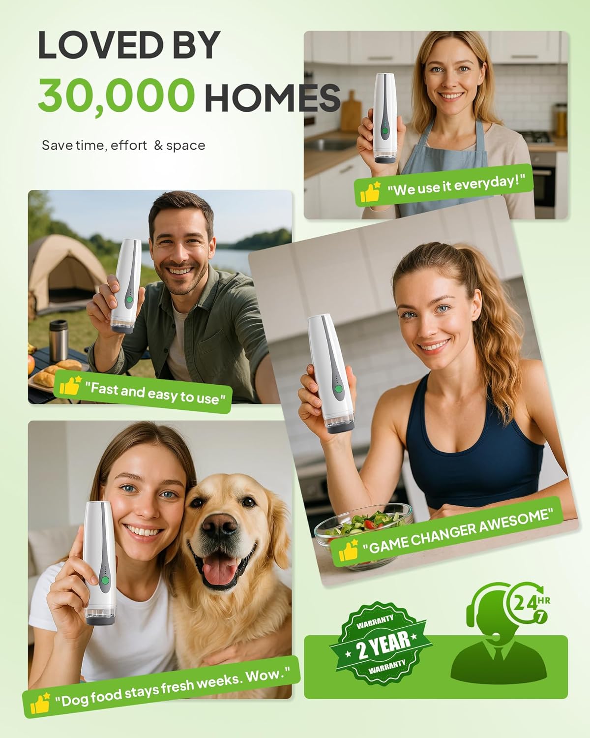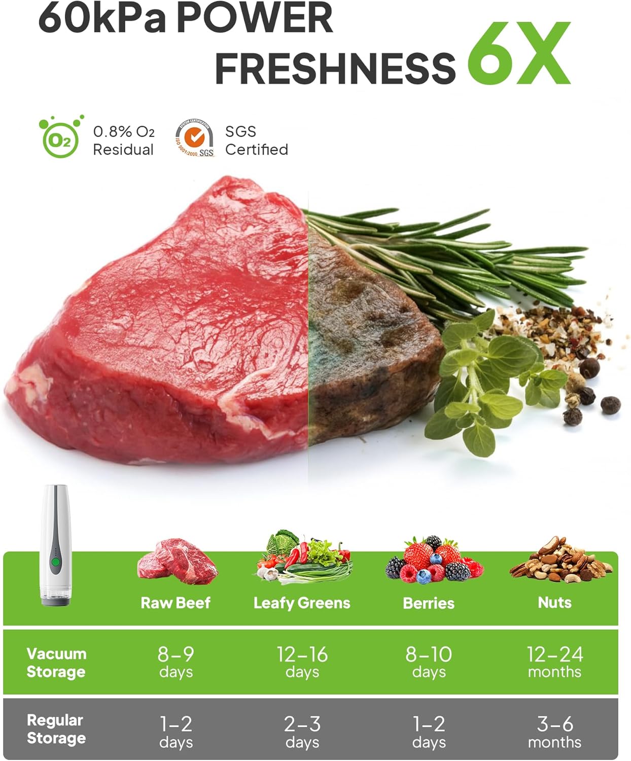 [6X Longer Freshness & One-Touch Simplicity] Seal food in just 6 seconds with a single press! This handheld vacuum sealer uses advanced technology to lock in freshness up to 6X longer—reducing waste and saving money. Perfect for meal prep, leftovers, and bulk storage with your food vacuum sealer machine.