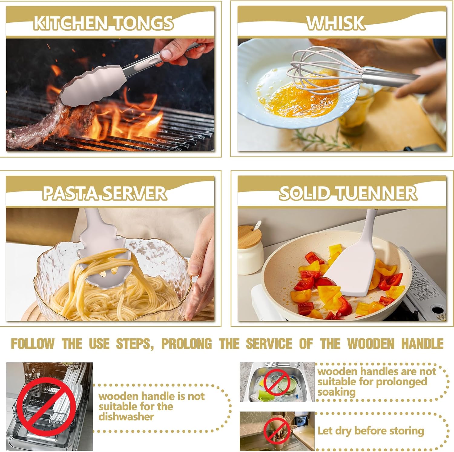 Due to the soild wooden handle, We don’t recommend soaking in water for a long time or dishwasher cleaning. However, the small spatula, food tongs, and utensil holder are dishwasher safe
