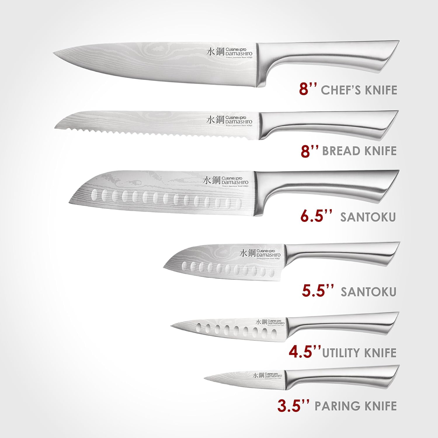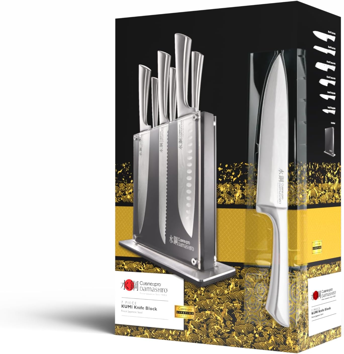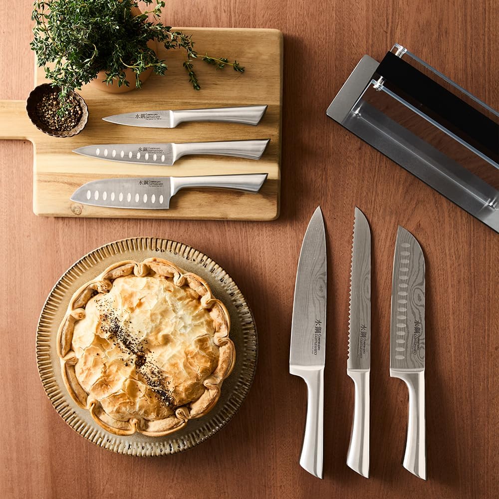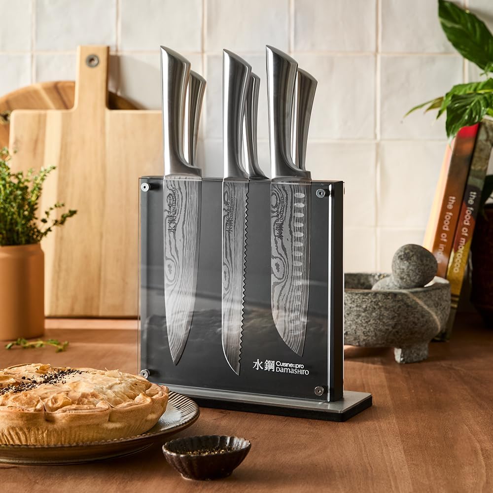 Cuisine::pro Damashiro Knife Block (Kumi, 7-Piece Chef Knife Set) – Japanese Steel Knife – Magnetic Knife Block- Damascus-Inspired Blade Kitchen Knives