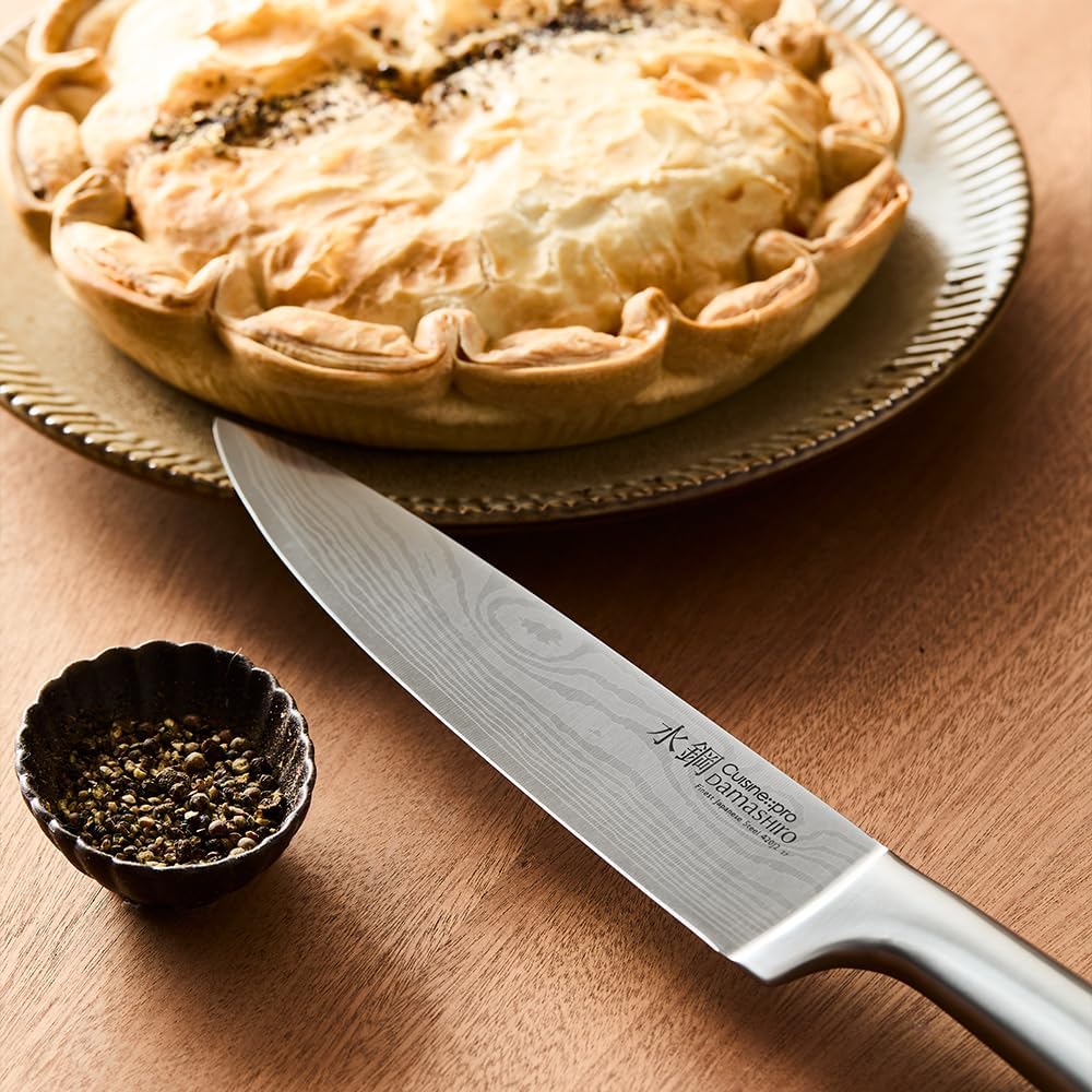 Each Damascus-inspired blade has been ice-hardened and twice-sharpened with a traditional Japanese leather honing technique