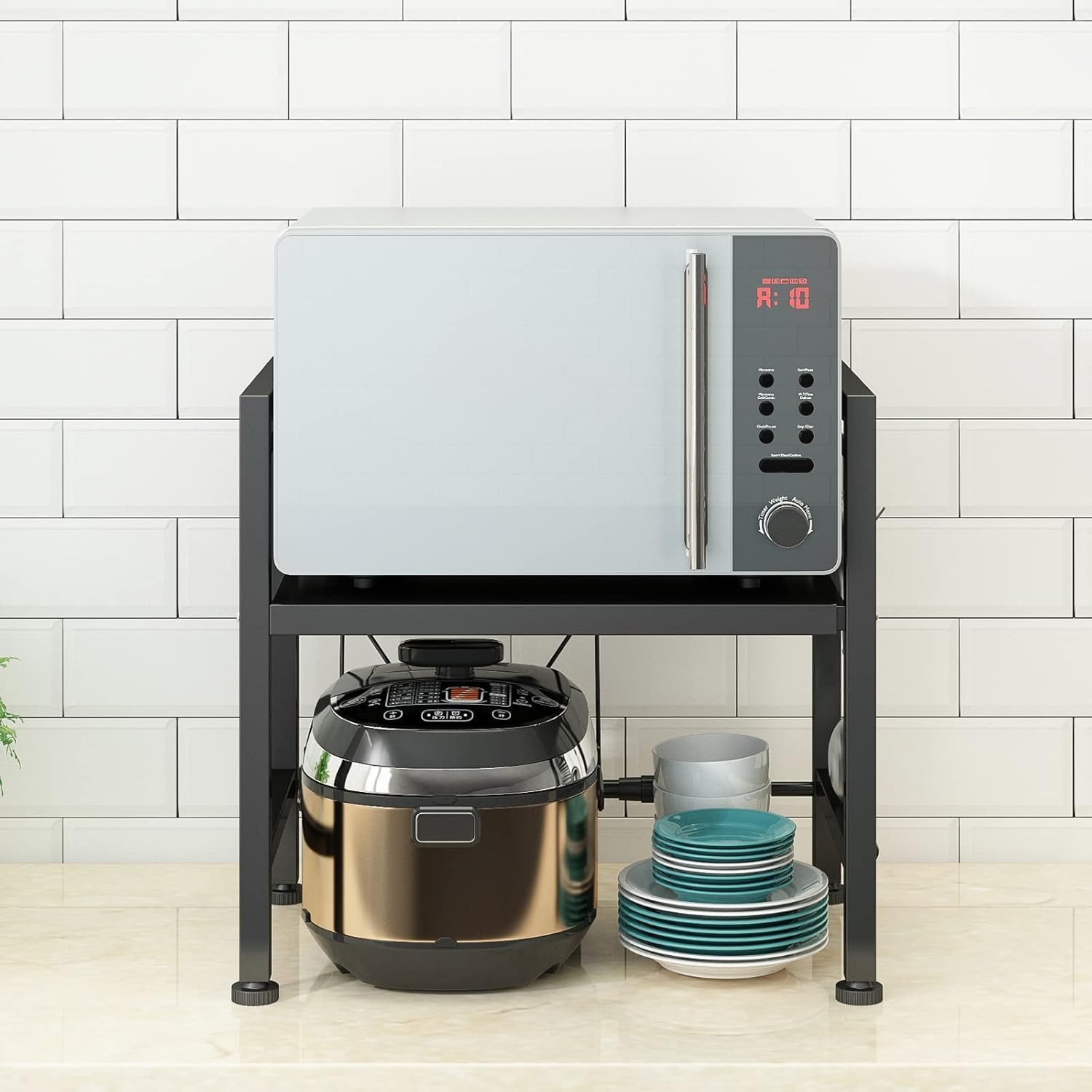 NOTE: IN ORDER TO ENSURE THE STABILITY OF MICROWAVE STAND, PLS DO NOT EXPANDE THE LENGTH OVER 24.67 INCHES. Expandable Microwave Counter Stand: The length of this microwave shelf stand can be adjusted from 16.17″ to 24.67″ according your needs. You can adjust the size to store a microwave oven and other kitchen untensils to help you save more kitchen space.
