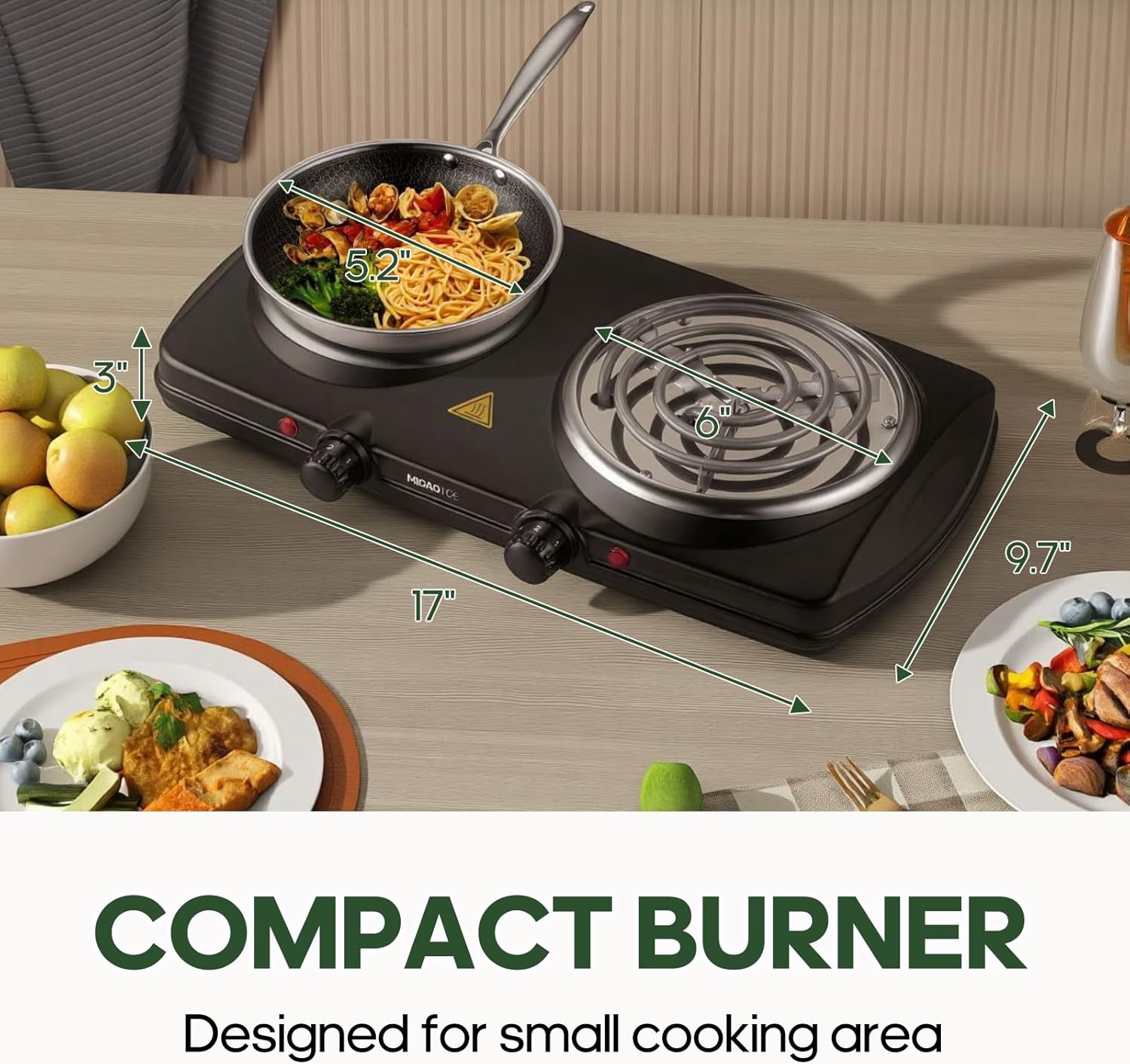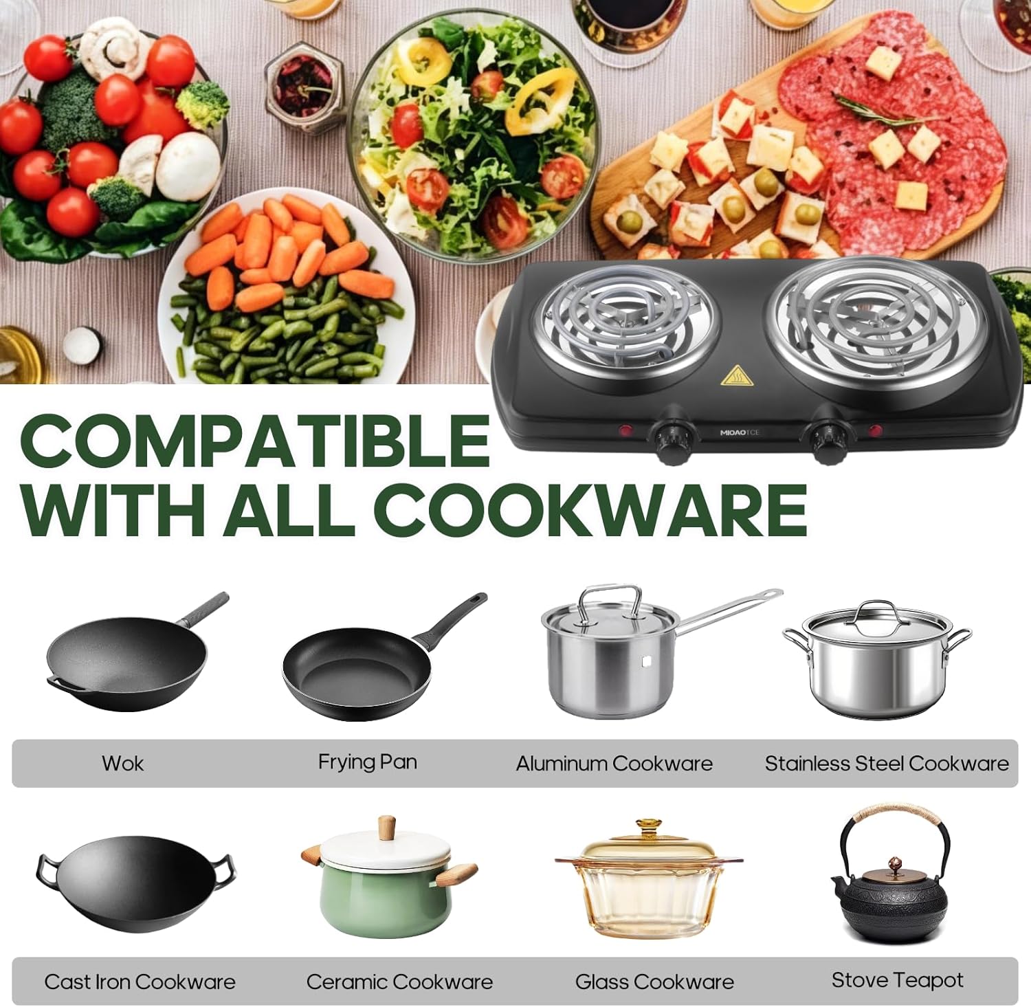 【UNIVERSAL COMPATIBILITY & EASY MAINTENANCE】Use your favorite pots and pans! This versatile electric burners for cooking works with a wide range of cookware. Cleaning is a breeze—just wipe down the smooth steel surface and coil with a damp cloth after it cools.