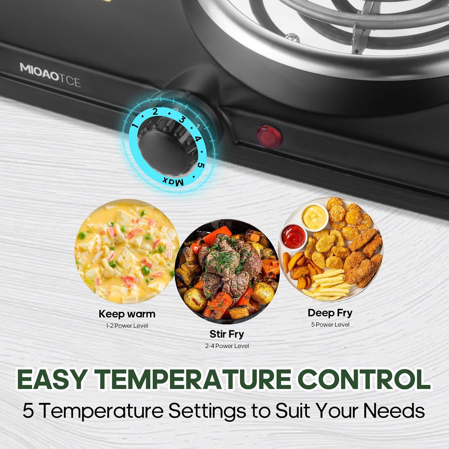 【PRECISE 5-LEVEL TEMPERATURE CONTROL】Achieve perfect cooking results every time. Simply turn the knob to choose from 5 precise temperature settings, ideal for simmering, frying, or boiling. The clear heating indicator light lets you know exactly when the electric burner is on and heating up, giving you full visual control.