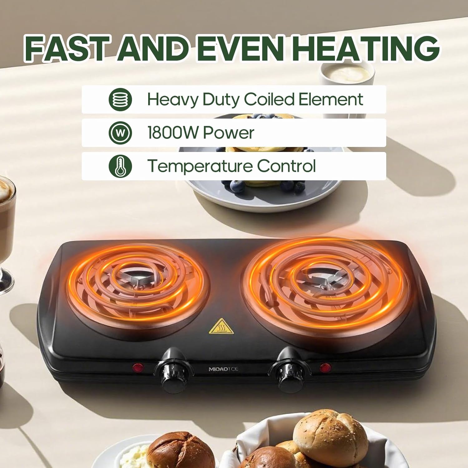 【FAST, EVEN HEATING & DURABLE CONSTRUCTION】Experience quick meal prep with the powerful 1800W hot plate that heats up rapidly. The durable coil heating element ensures even temperature distribution across the entire cooking surface, preventing hot spots. Built with a sturdy steel housing, this hot plate electric is made to last through years of daily use.