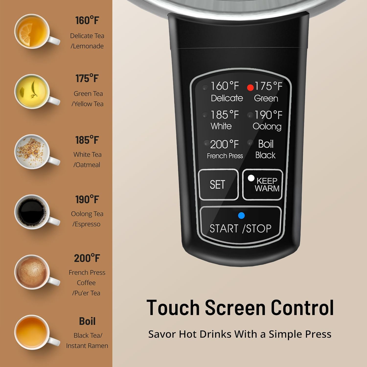 Precise Temperature Control Electric Kettle: Choose from 6 preset temperatures to get the best, most flavorful teas, coffees or simply boil cooking water (160°F for Delicate Tea, 175°F for Green Tea, 185°F for White Tea, 190°F for Oolong Tea, 200°F For French Press Coffee. And “Boil” 212°F for Black Tea, Instant Cocoa, Oatmeal, Noodles, and More)