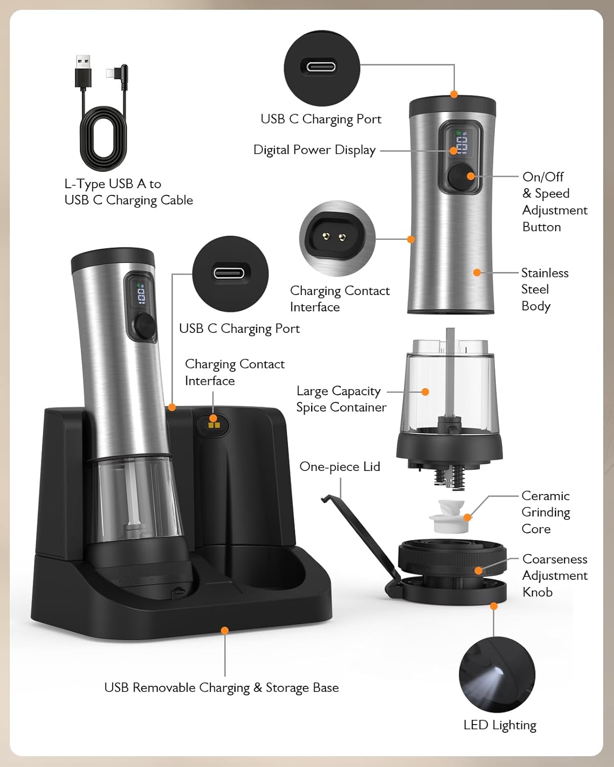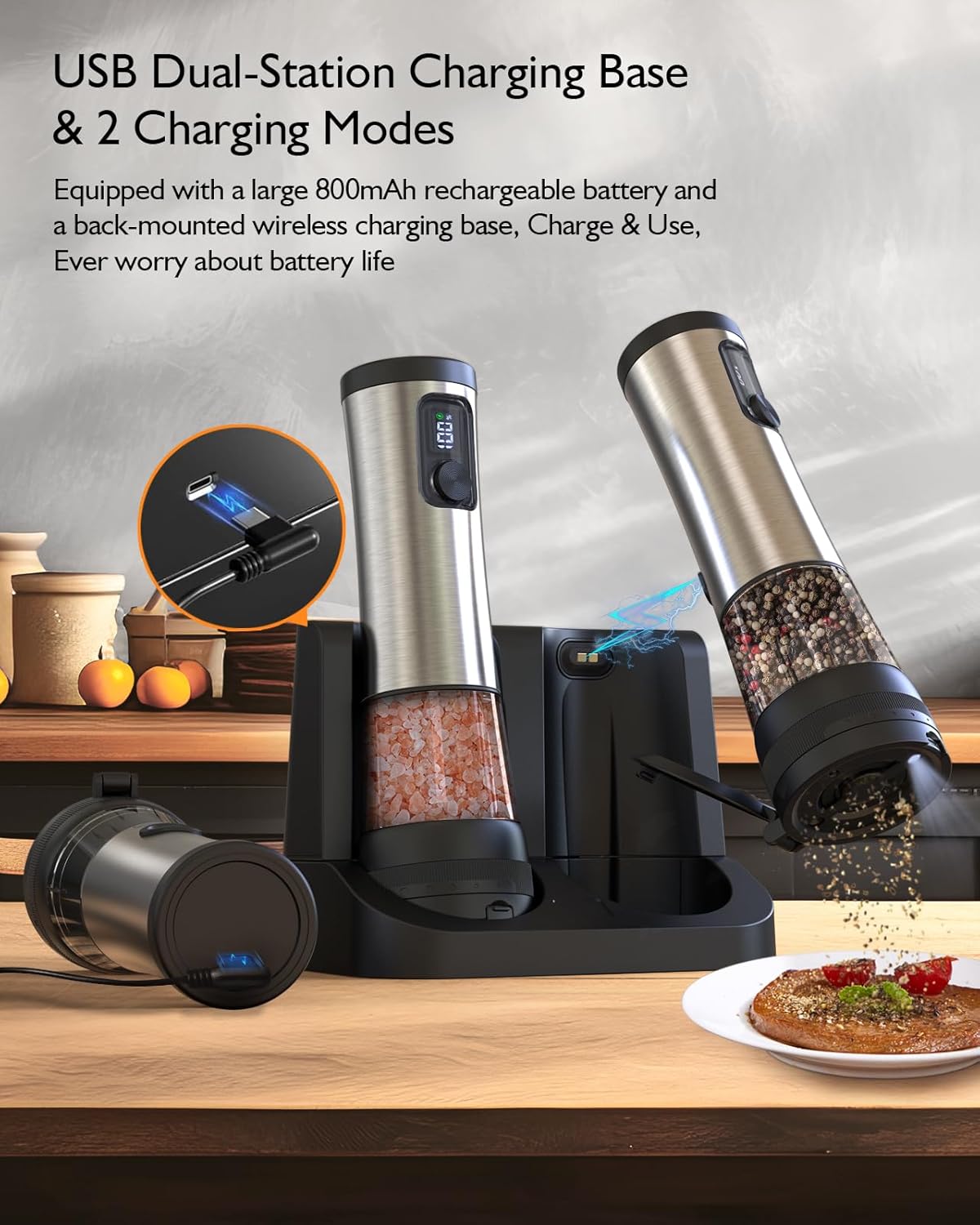 【USB Dual-Station Charging & Storage Base】Our rechargeable salt and pepper grinder set comes with a USB dual charging and storage base. Simply place the grinders in the base (align the charging ports until the charging icon and battery percentage appear) to charge both grinders simultaneously. You can also plug the USB charging cable into the type-c charging port of the mill for fast charging. The lower part of the base (non-electrical components) can be removed and washed.
