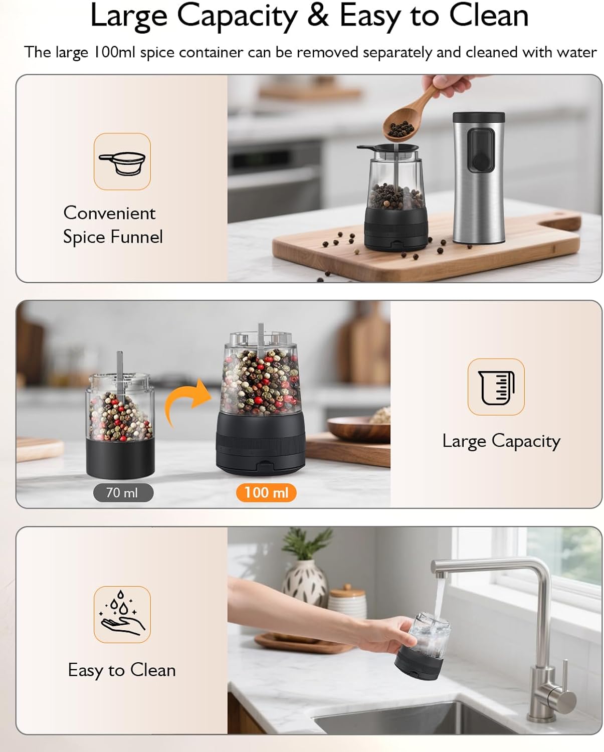 【100ml Large Capacity & Removable Design】The electric salt and pepper shaker spice container is made of transparent food-grade acrylic and the capacity is upgraded to a rare large capacity of 100 ml. Allowing you to easily check remaining spices and distinguish them at a glance. Frequent refills are unnecessary. The spice container can be removed and washed for easy and thorough cleaning. (Note: The electronic components of the spice grinder are not washable.)