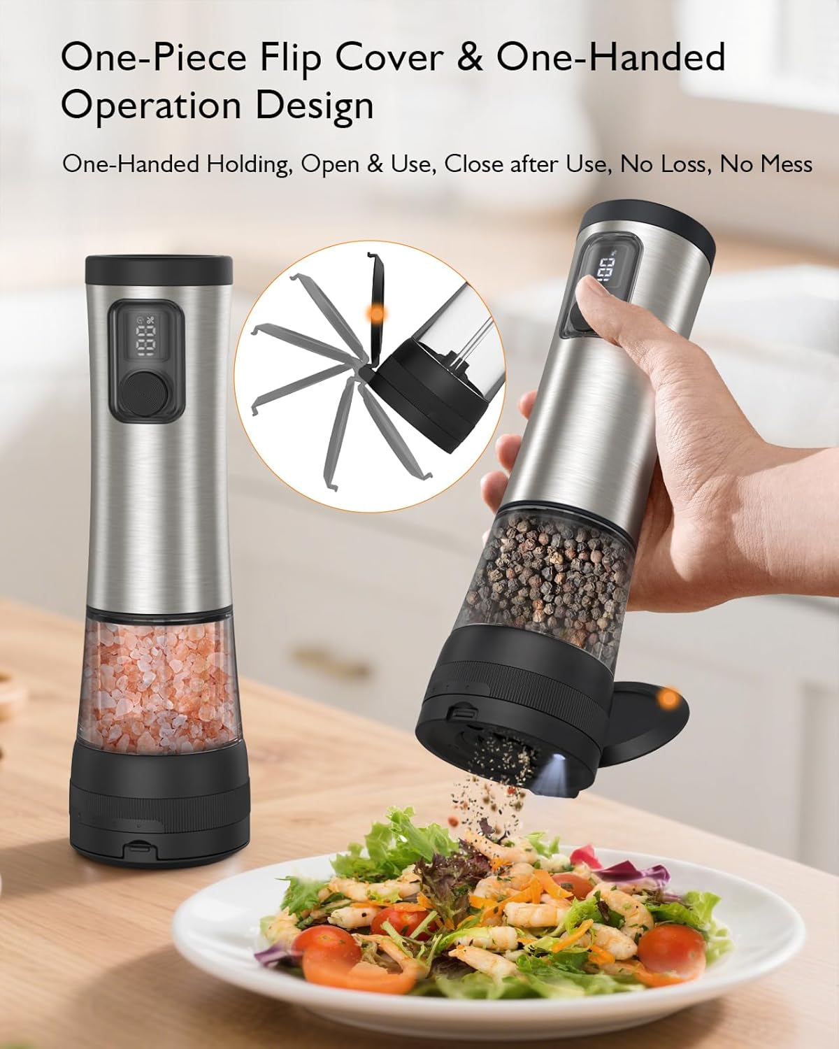 【One-Handed Operation】This automatic salt and pepper grinder features an ergonomic design with perfect curves and an innovative one-piece flip lid for easy one-handed operation. Just press a button to start automatic grinding, and say goodbye to manual rotary grinding, making cooking more convenient. Built-in LED light comes on automatically while it’s working to help you see exactly where the spices are falling and how much is coming out.