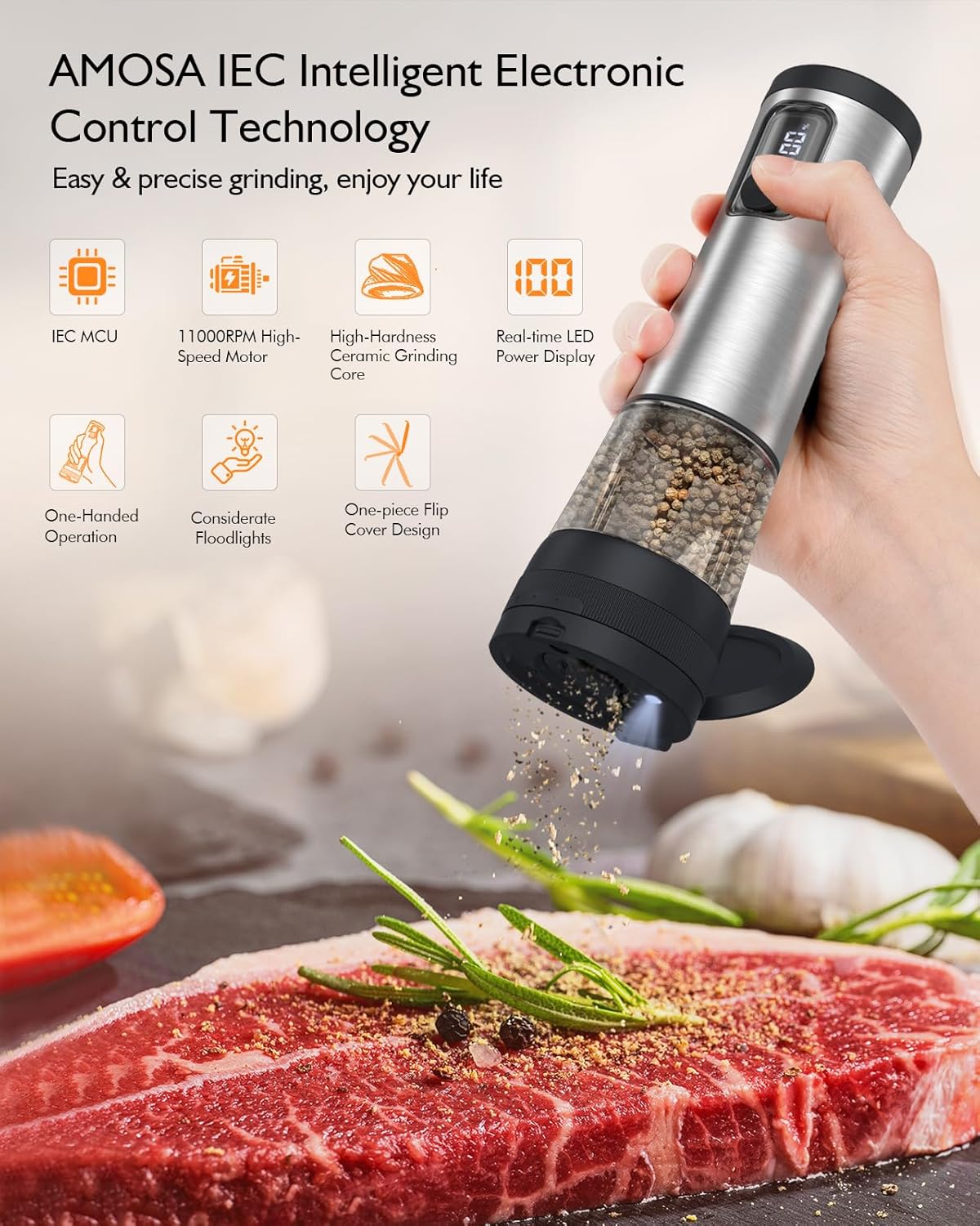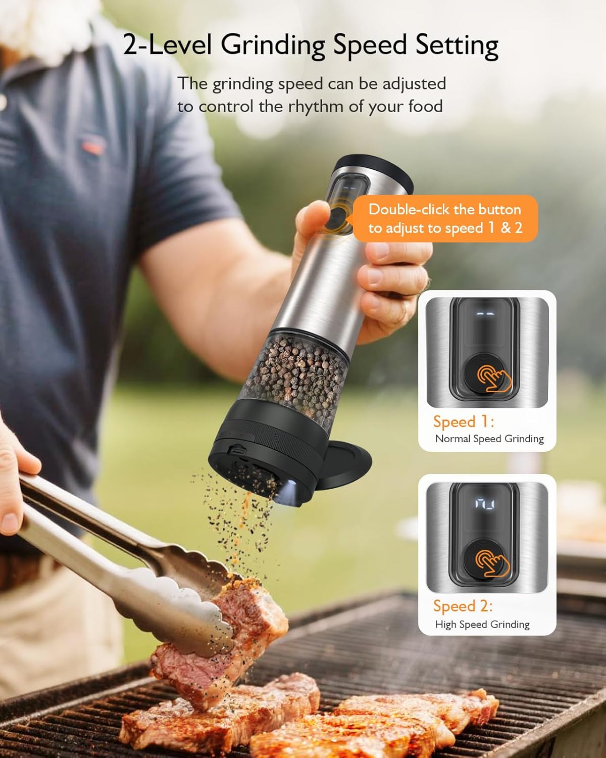 【2-Level Adjustable Grinding Speeds】Innovative Upgrade! For even more precise cooking, the AMOSA electric salt and pepper mill innovatively offers 2 grinding speeds, allowing you to add different spices more quickly or slowly, depending on your preference or cooking requirements. Easily adjust the speed: Double-click the button to switch to Speed 1 or Speed 2. And Speed 2 is faster than Speed 1. Make cooking a pleasure.