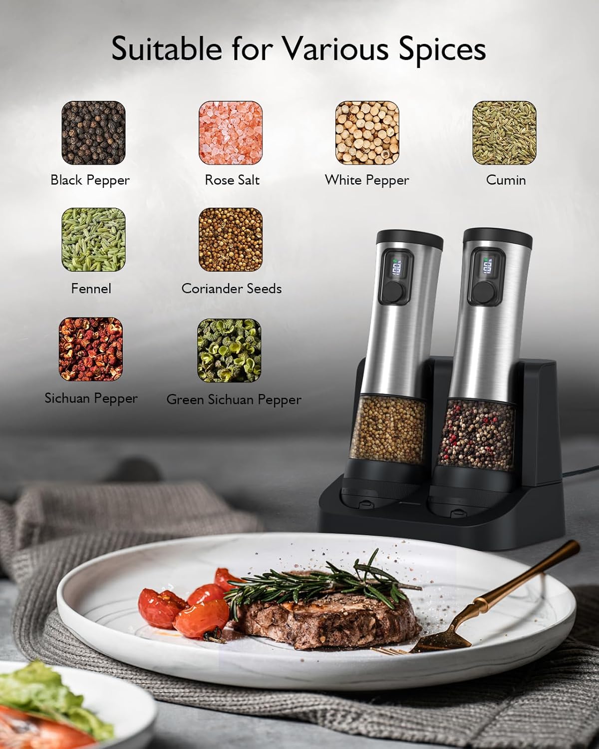 The grinder set comes with a rechargeable base that allows you to easily charge the grinders when not in use.