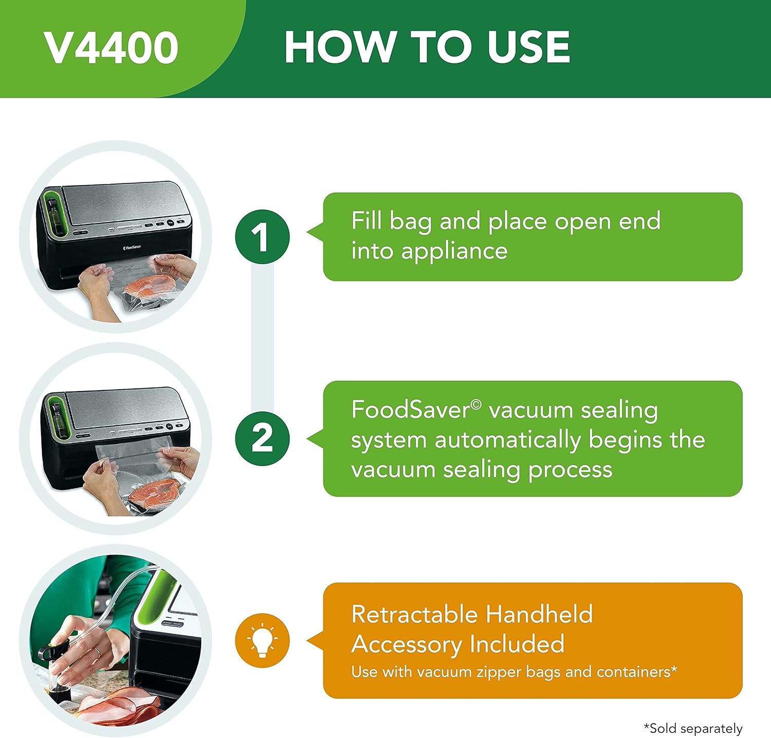 COMPATIBILITY: WORKS WITH FOODSAVER 8 INCHES AND 11 INCHES VACUUM SEAL ROLLS, ALL PRE MADE BAG SIZES, FRESHSAVER ZIPPER BAGS, FRESH CONTAINERS, AND QUICK MARINATOR; OPTIONAL ACCESSORIES INCLUDE FOODSAVER REGULAR AND WIDE MOUTH MASON JAR SEALERS AND FOODSAVER BOTTLE STOPPERS FOR WINE AND OIL BOTTLES