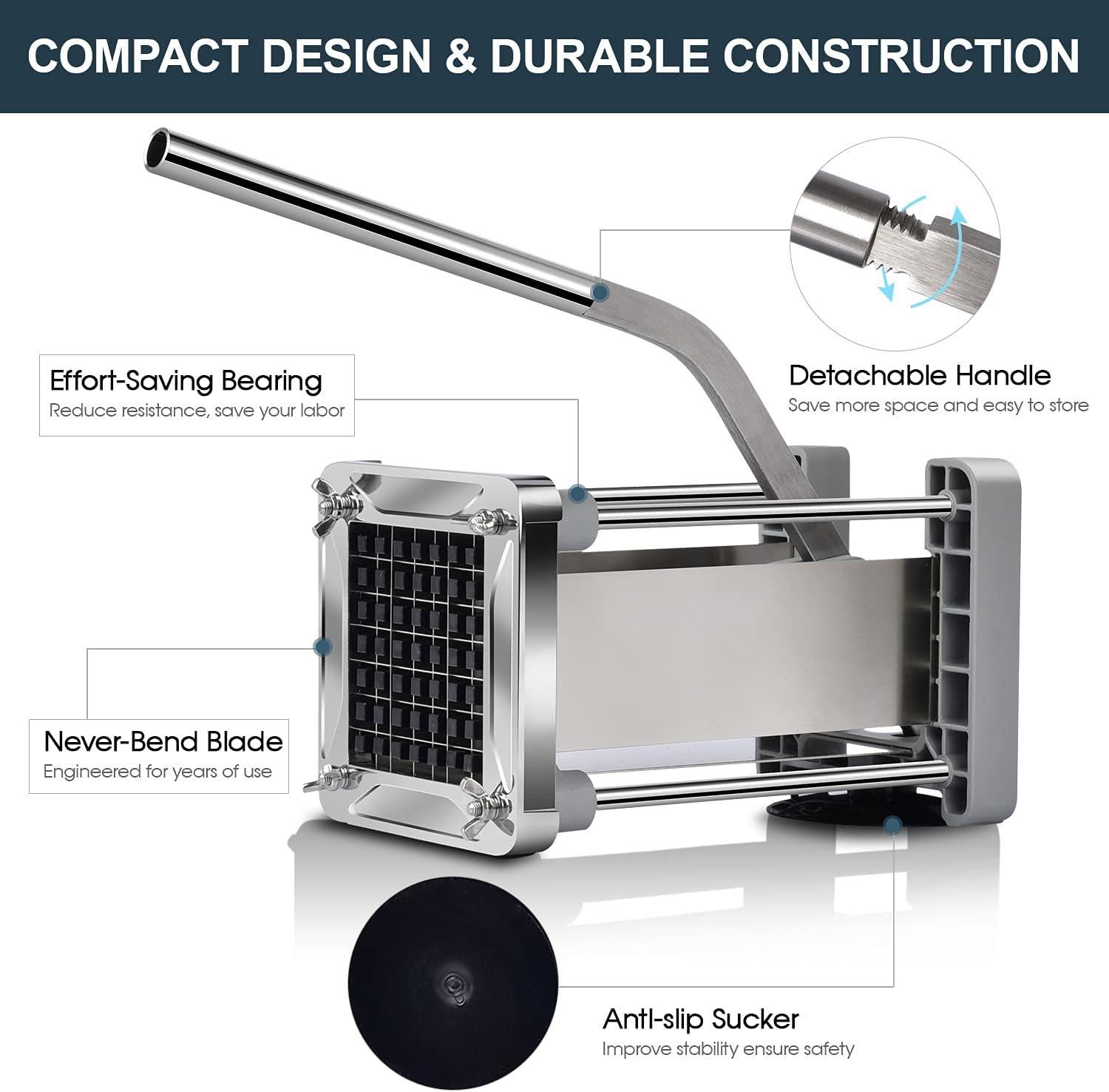 SPACE SAVING AND EASY TO CLEAR: Unlike commercial French fry cutter in the market, which takes too much space, this potato cutter has small volume as well as commercial grade quality. Easy to clean with water, never be worried about rinsing and rust, use the cutter easily