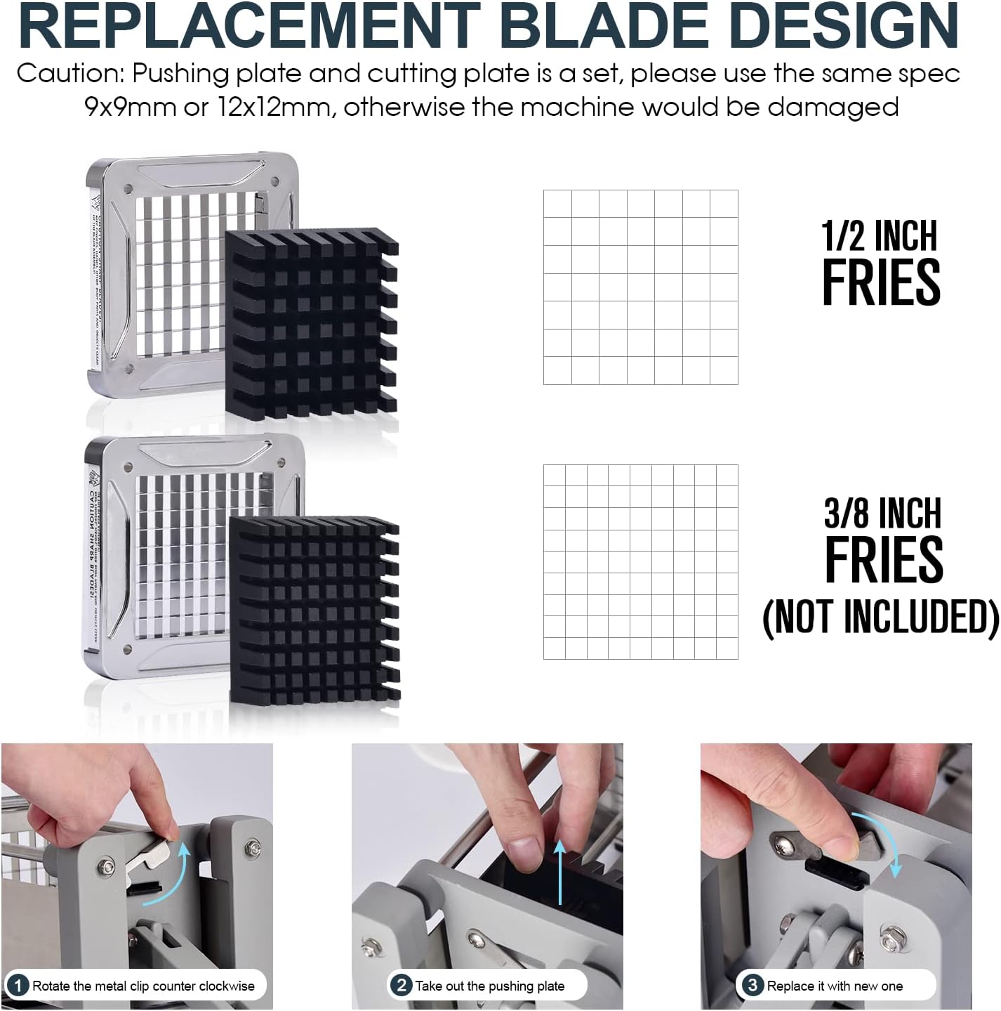 CONVENIENT FOR ALL: Cuts fries in 1/2″ pieces. Also great for zucchinis, cucumbers and other vegetables, fruits into perfectly shaped sticks in seconds. Create stunning French fries, sweet potato fries, etc. For thinner 3/8 Inch blade, you may check our store and search 3/8 inch blade