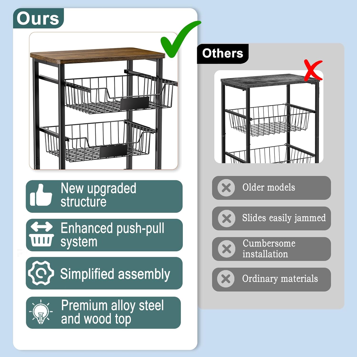 We Have Upgraded the Structure of This Onion and Potato Storage Cart, making it stronger and easier to assemble compared to older models offered by our competitors. Constructed from heavy gauge alloy steel and rustic brown board, it is built to last and features a BPA-free, food-safe powder coating.