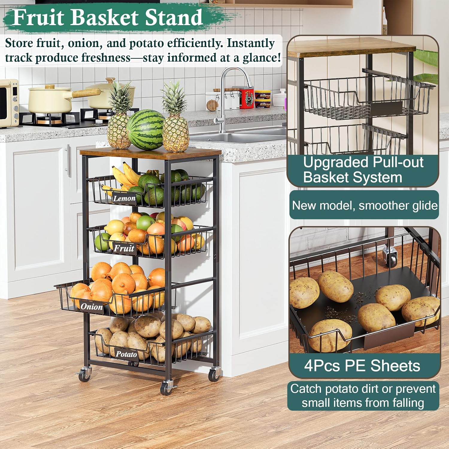 Our 5-Tier Fruit Basket Comes with Pull-Out Baskets that have DIY chalk labels for easy organization and access. Perfect for storing fruit, produce, and small items such as vitamin bottles and herbs.