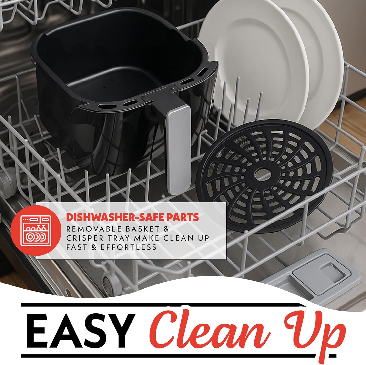 Easy Cleanup – Nonstick, Dishwasher-Safe Basket : Basket and crisper tray are removable and top-rack safe.
