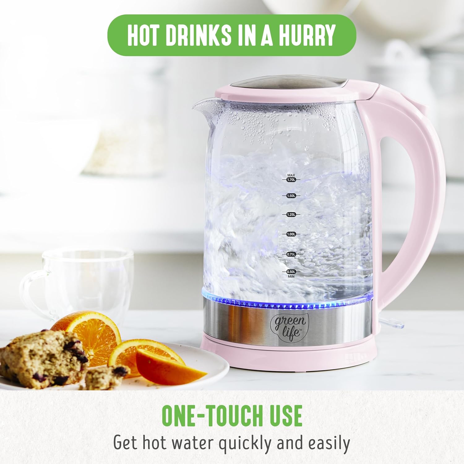 Faster than a microwave and easier than the stovetop, the GreenLife Qwik & EZ Kettle is ready to heat drinks in hurry. Whether you need water for beverages, oatmeal, or boiling an egg, the 1.7L capacity allows you to heat things up for the whole family. The one-touch design gives you hot water fast and the filtered spout is wide and V-shaped for easy pouring. The cordless design lets you maneuver the kettle with ease while the protective handle keeps your hands safe from the glass. Plus, the auto shutoff function gives you overheat and boil-dry protection.
