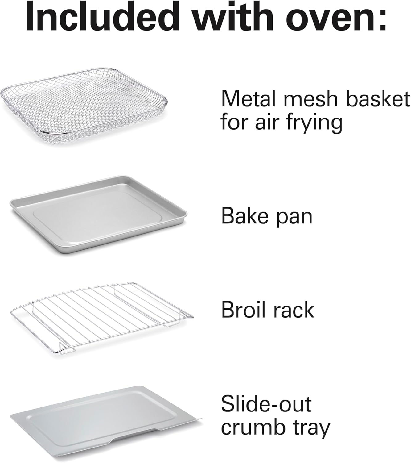 This Hamilton Beach air fryer convection toaster oven includes a metal basket for air frying, bake pan, broil rack, and slide-out crumb tray—ideal for baking, broiling, toasting, and air frying.