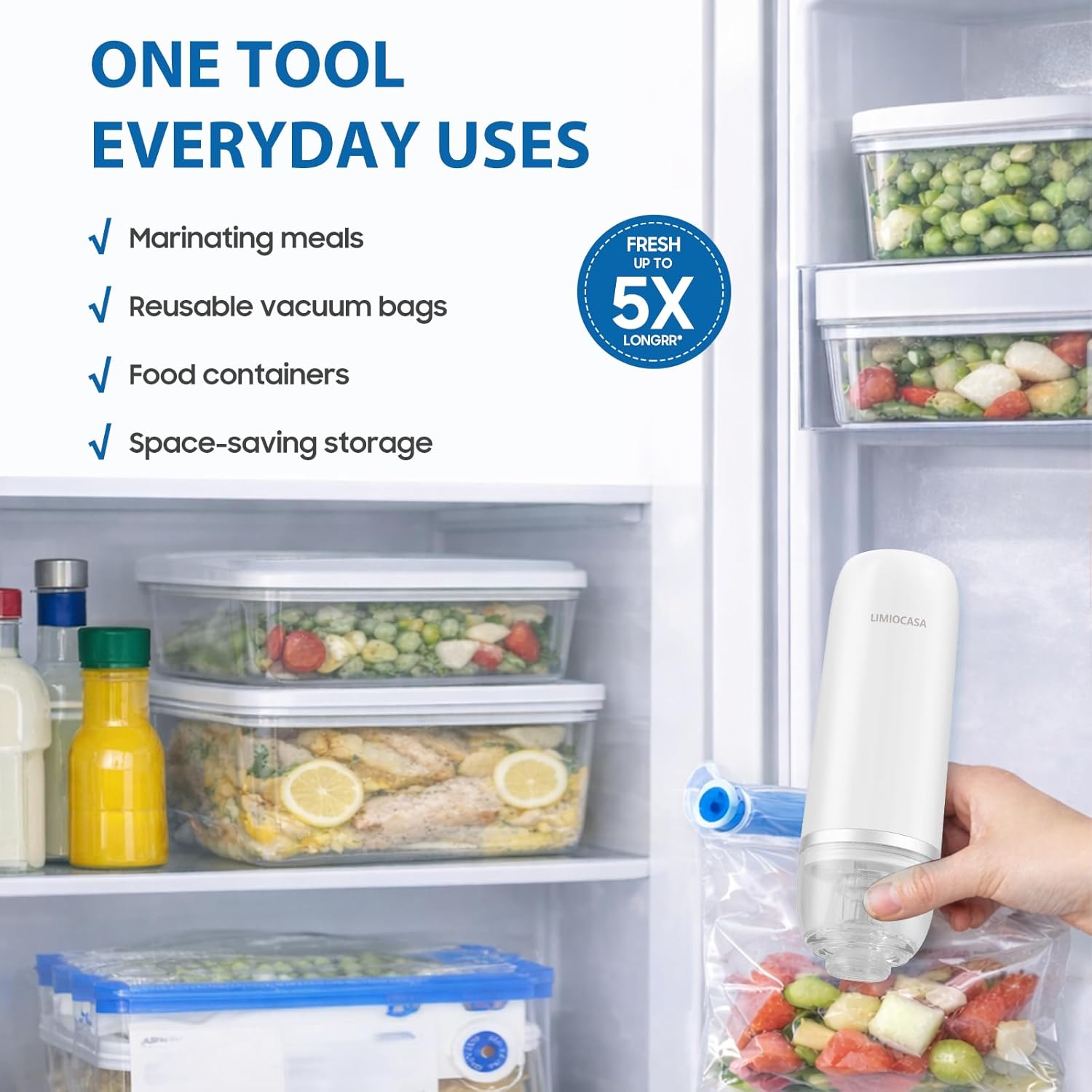 Reusable Vacuum Bags Included: Comes with reusable vacuum storage bags for sealing meat, produce and dry foods. Helps reduce freezer burn and minimize food waste.