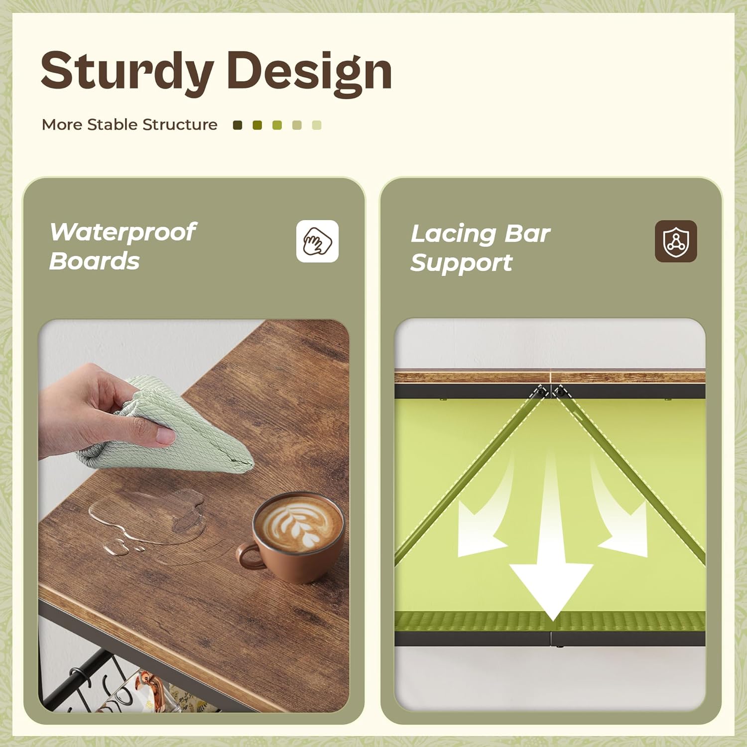 【Stable Construction】Built to last with premium particle board and a durable metal frame, this coffee bar station can handle heavy kitchen appliances with ease. This coffee stand also comes with adjustable feet for uneven floors and anti-tip kits for stability