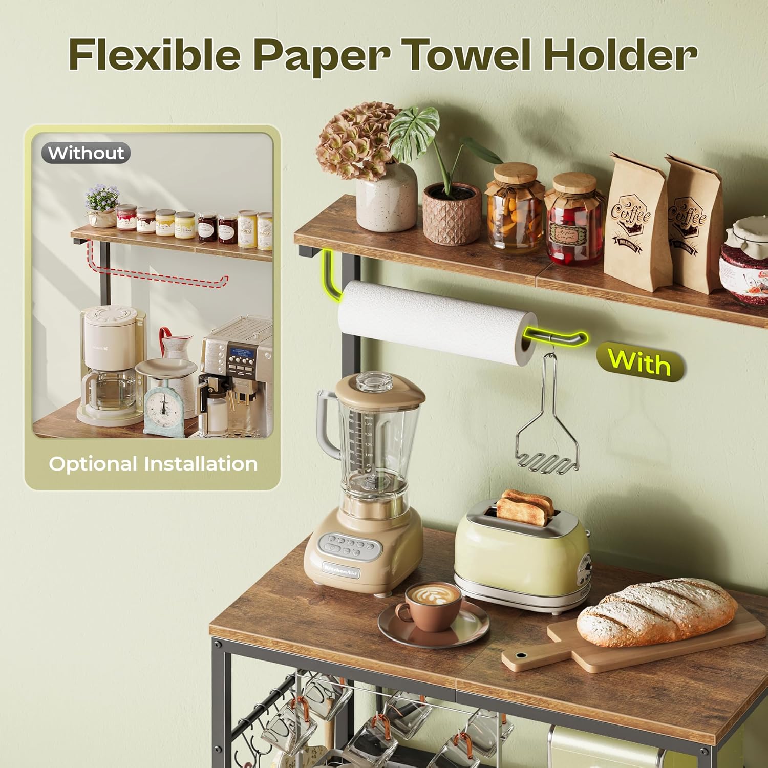 【Paper Towel Holder & Deep Desktop】Enjoy the convenience of a paper towel hook right where you need it. The wide top shelf provides a stable surface for your largest kitchen gadgets, helping you free up valuable countertop space and keep your kitchen clutter-free