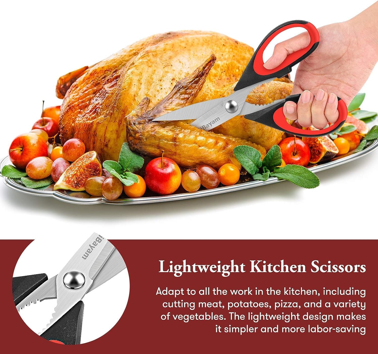 1. Versatile kitchen scissors: These all-purpose shears are perfect for food, meat, vegetables, chicken, poultry, fish, herbs, seafood, BBQ, and food packing bags – essential utility scissors for kitchen, home, apartment, and camper.【patented design】