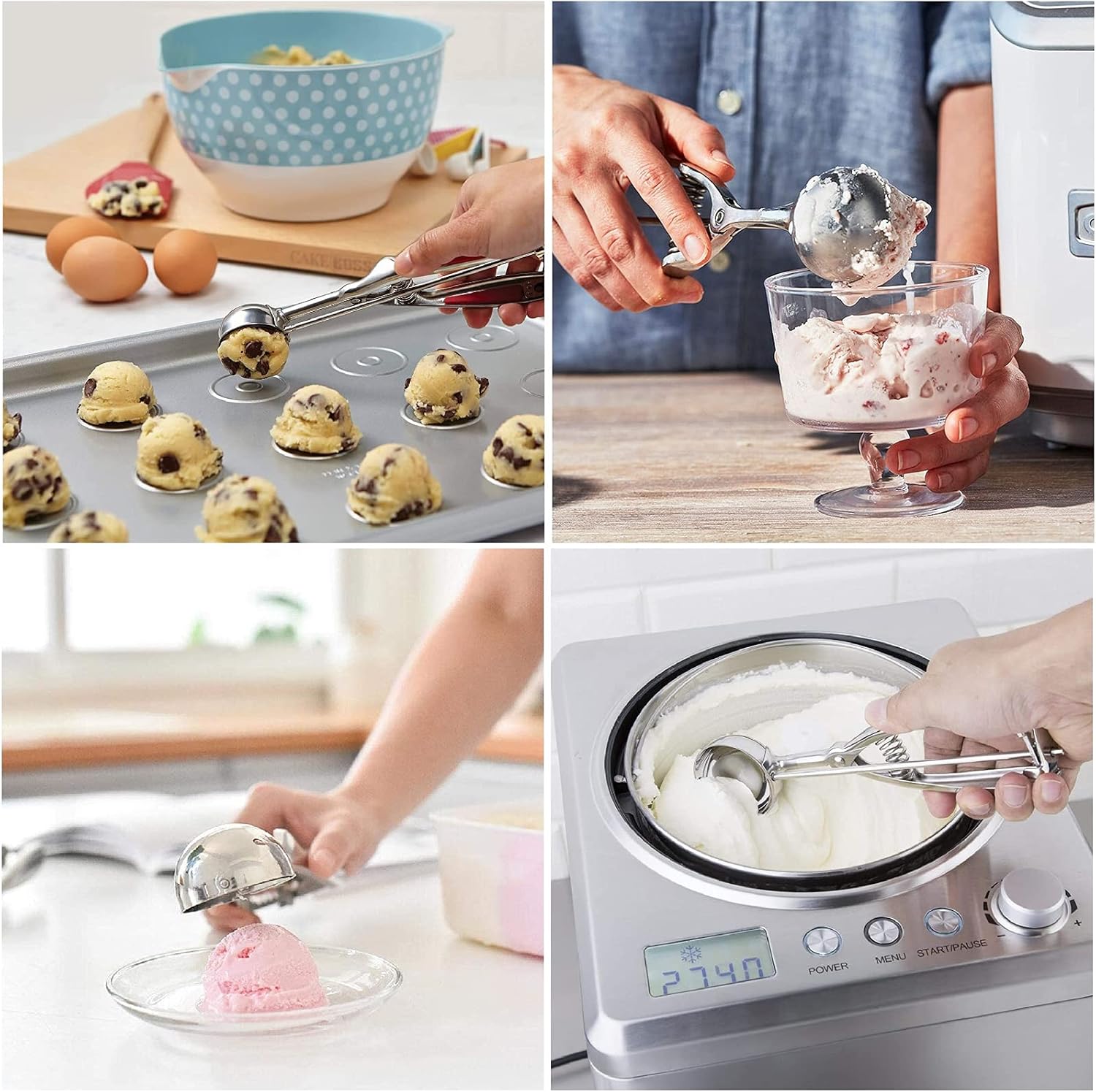 Not only ice cream scoop and cookie scoop. With the large, medium, and small cookie scoop, you can easily create beautiful and different size balls of many healthy food like muffin, mashed potatoes, melon, and other fruits sorbet. Hand rolling meatball days are over! Save you so much time in kitchen!
