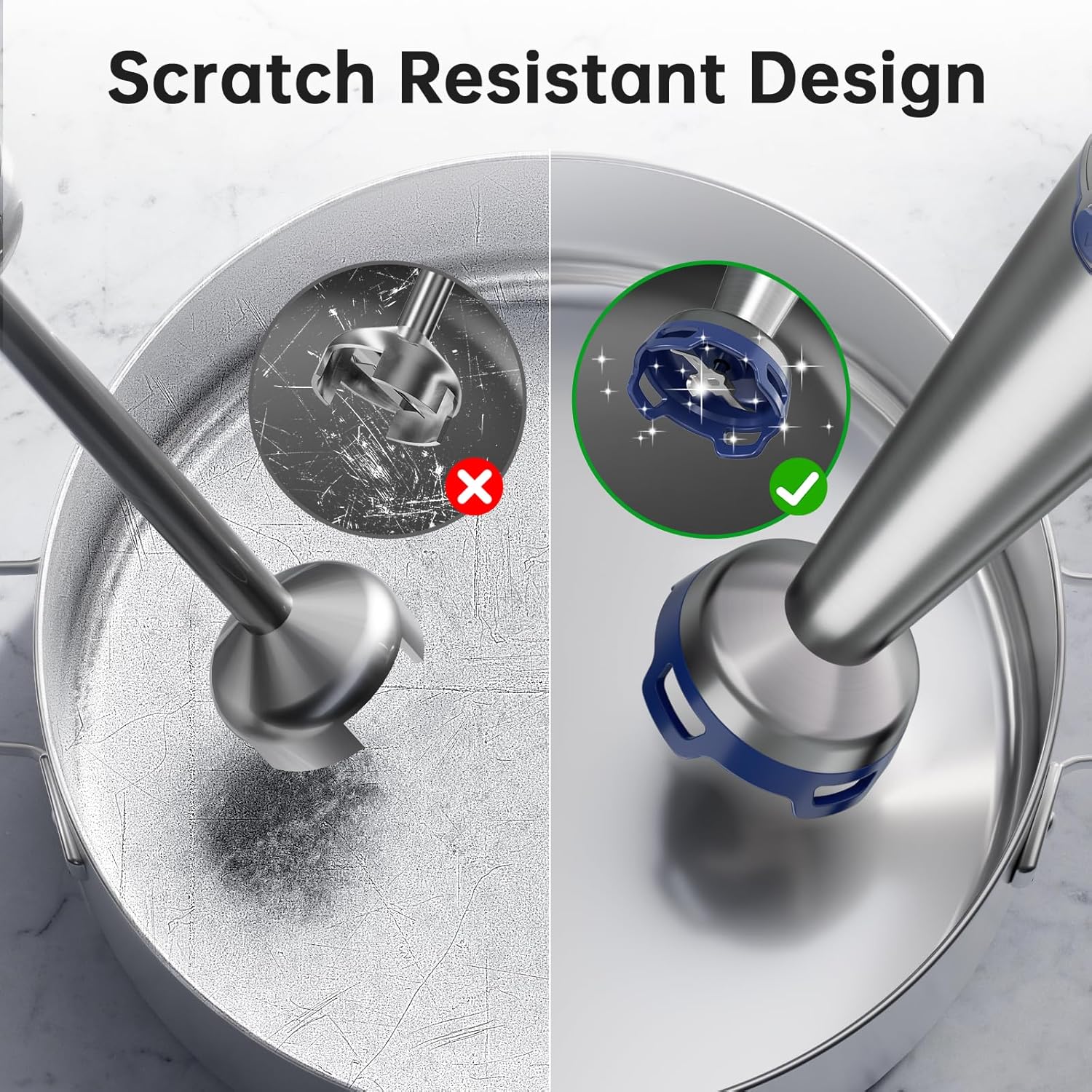 Effortless Clean-Up, Scratch-Free: Features a unique food-grade nylon blade guard designed to minimize suction, preventing scratches on your pots and pans and keeping splashes at bay for a cleaner kitchen and hassle-free clean-up