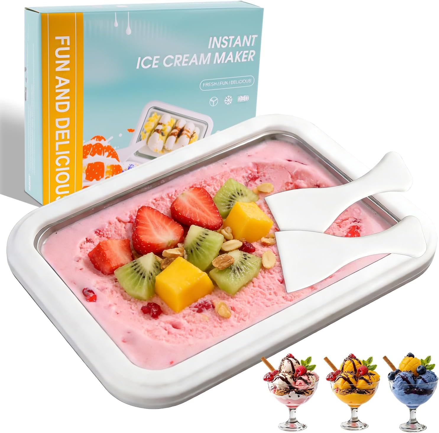 Instant Ice Cream Maker, Rolled Ice Cream Tray with Food Grade 304 Stainless Steel, Frozen Yoghurt Plate for Smoothies, Fruit Sorbets, and Gelato at Home, Easy to Use, Suitable for Home
