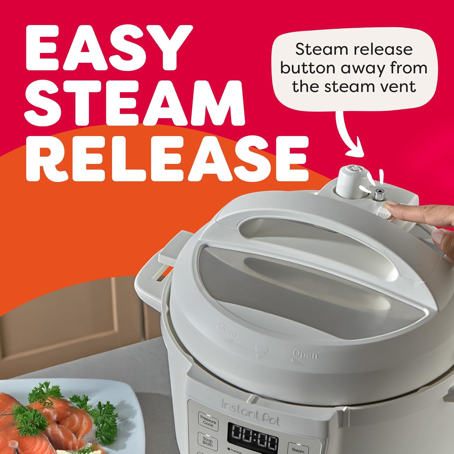 The Instant Pot RIO has an Easy-Release feature that ensures fast, safe, and simple steam release every time.