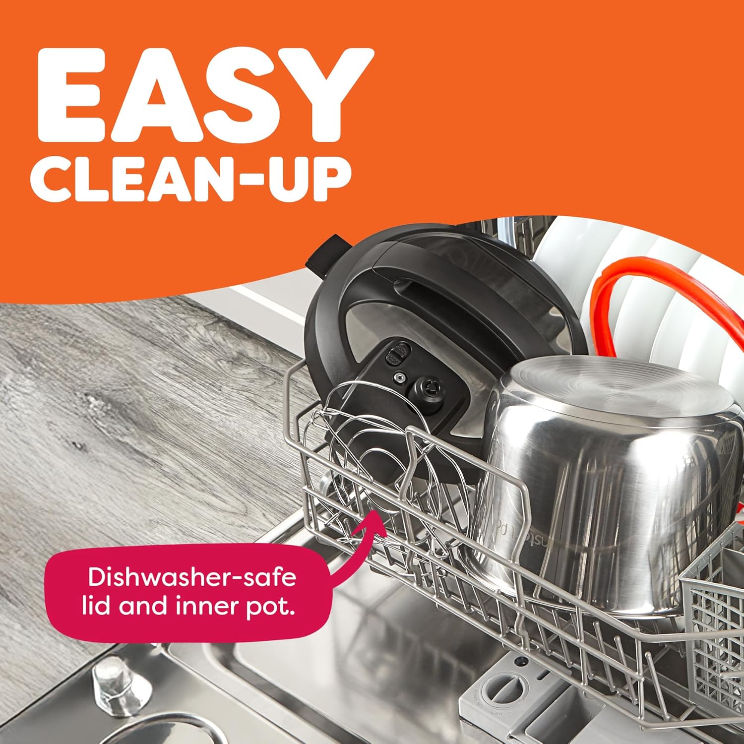 Quick Cleanup and A Little Extra: No more fighting about who has to do the dishes. The dishwasher-safe lid and inner pot make clean up a breeze. Includes 2 extra sealing rings and a stainless steel steam rack to keep you ready for anything