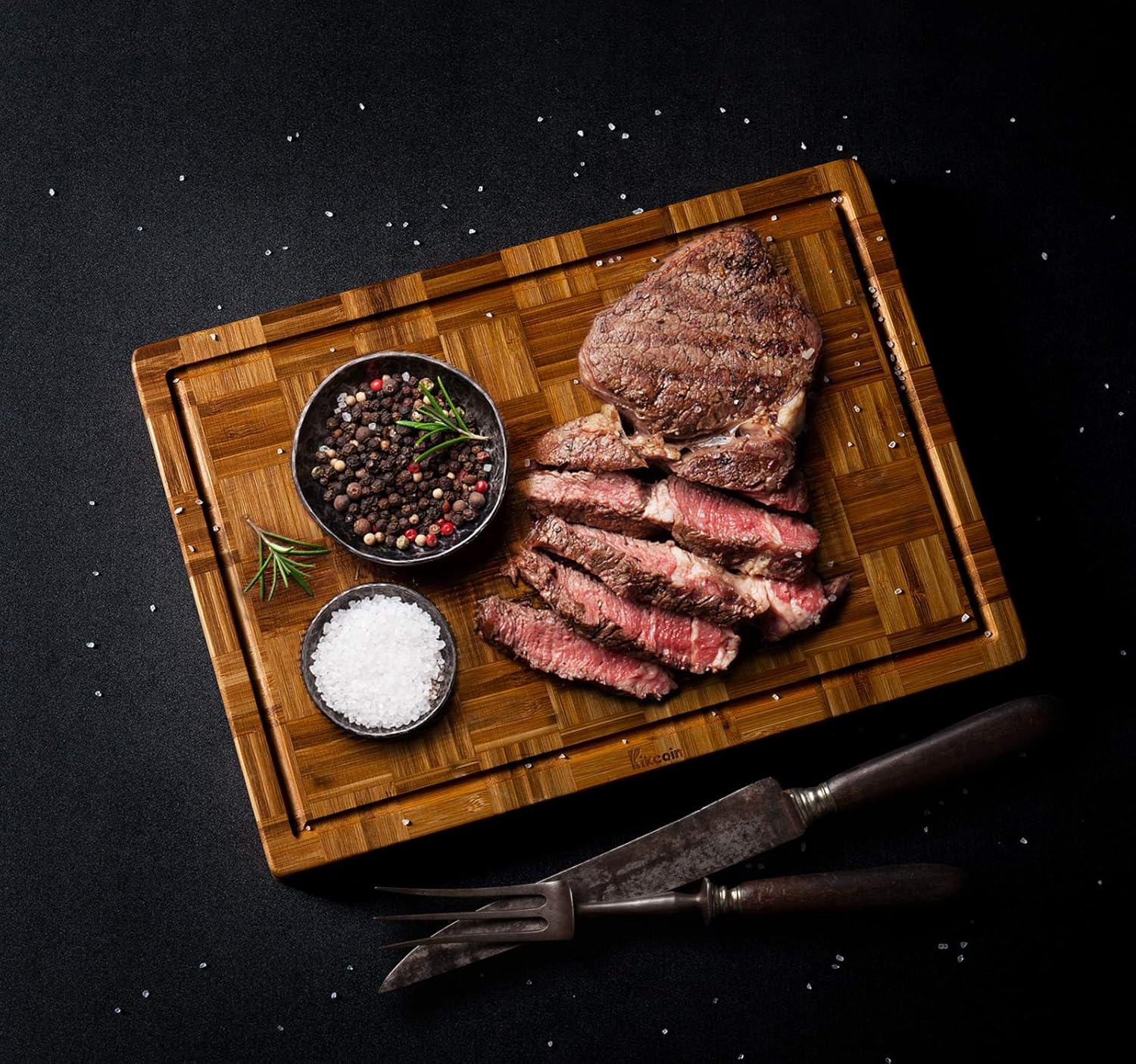 【DEEP JUICE GROOVES】Built-in deep juice grooves to capture excess liquid during food prep. No need to worry about meat, fruit, or vegetable juice running off the board and onto your countertop when cutting. Thus you can keep your work area beautiful even during the busiest cooking time.