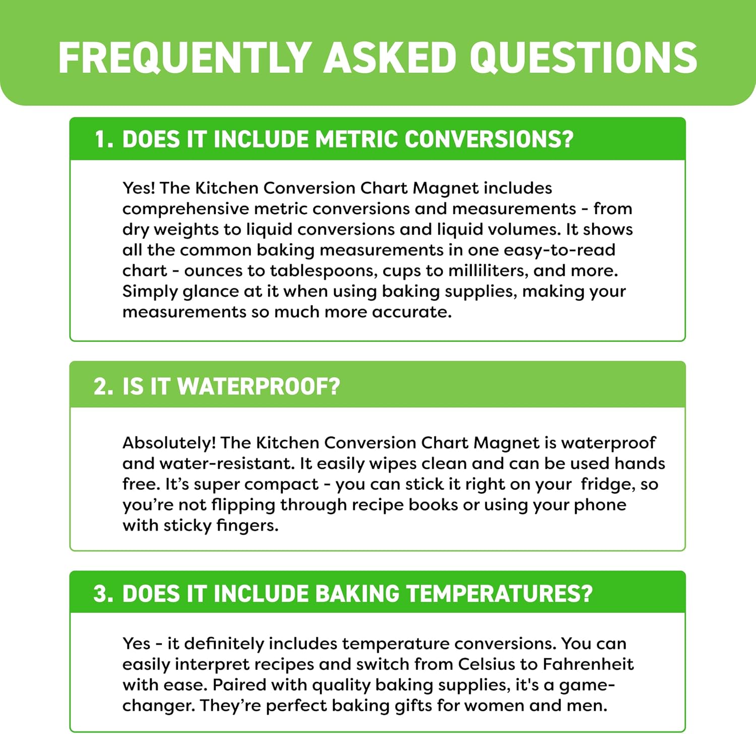 Waterproof and Engineered for Durability. Water-resistant kitchen measurements magnet wipes clean with ease and stays firmly in place with a strong rubber backing. From home kitchens to culinary school labs, this conversion table chart streamlines measuring for cookies, cakes, and pastries. Made to assist your baking process while pairing effortlessly with mixing bowls and measuring spoons, it’s ideal for any baking gadget lineup.