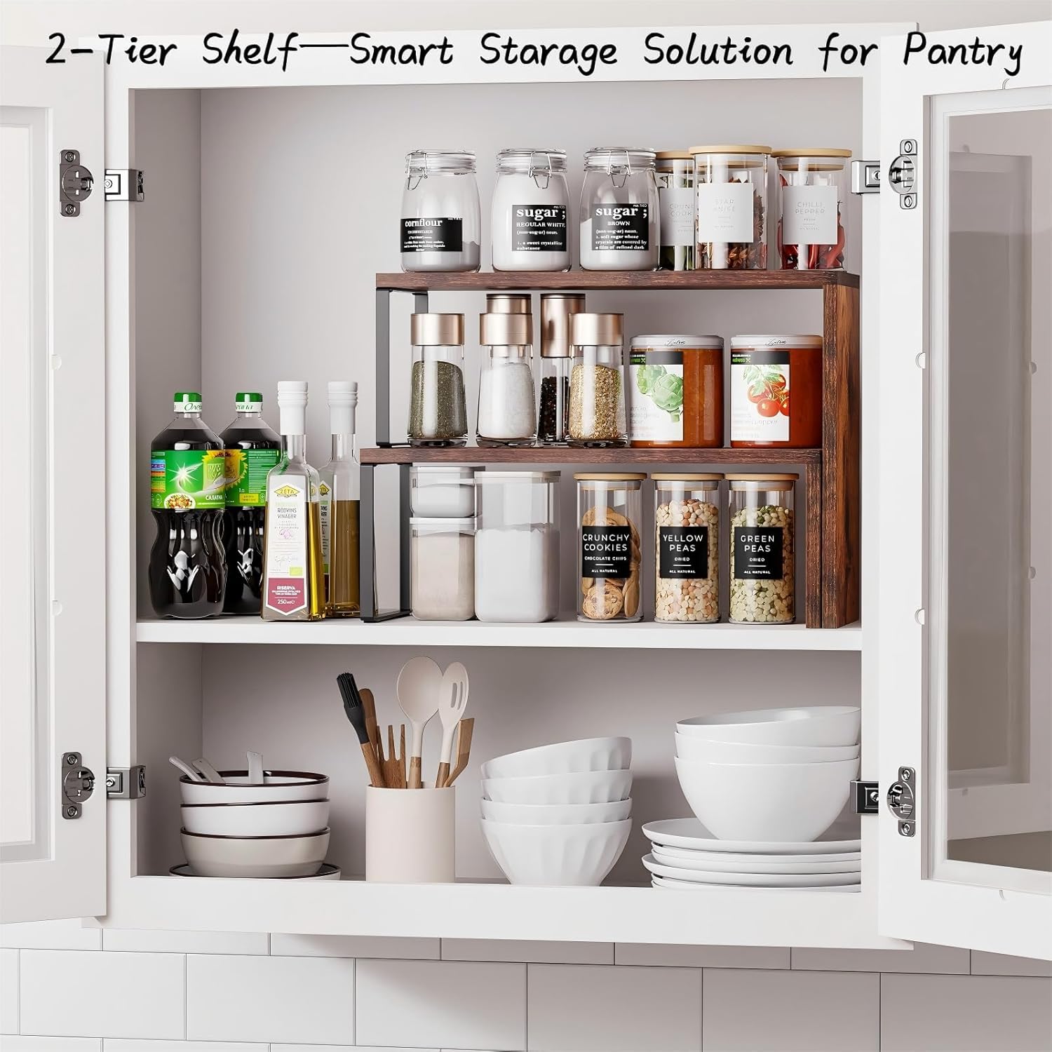[ Multipurpose Shelf and Space-saving ] The rustic brown finish adds a stylish touch.The cabinet shelves with sturdy construction perfectly use as spice rack, coffee station organizer, over sink shelf, bathroom countertop organizer, plant stand,desk top shelf without wobbling. It’s space-efficient yet offers ample storage, keeping countertops neat and organized. This two-tier countertop organizer is a great way to maximize space in any kitchen, home office,bar or coffee station