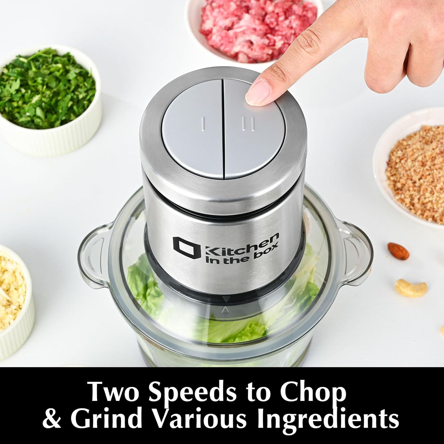 Durable Small Food Processor with 3-Cup Glass Bowl 💙 The 1L glass bowl is BPA-free and easy to clean. Its sharp 304 stainless steel blades make kitchen in the box food processor a versatile food chopper and grinder, perfect for vegetables, nuts, or meat. Safe, efficient, and ideal for daily cooking.